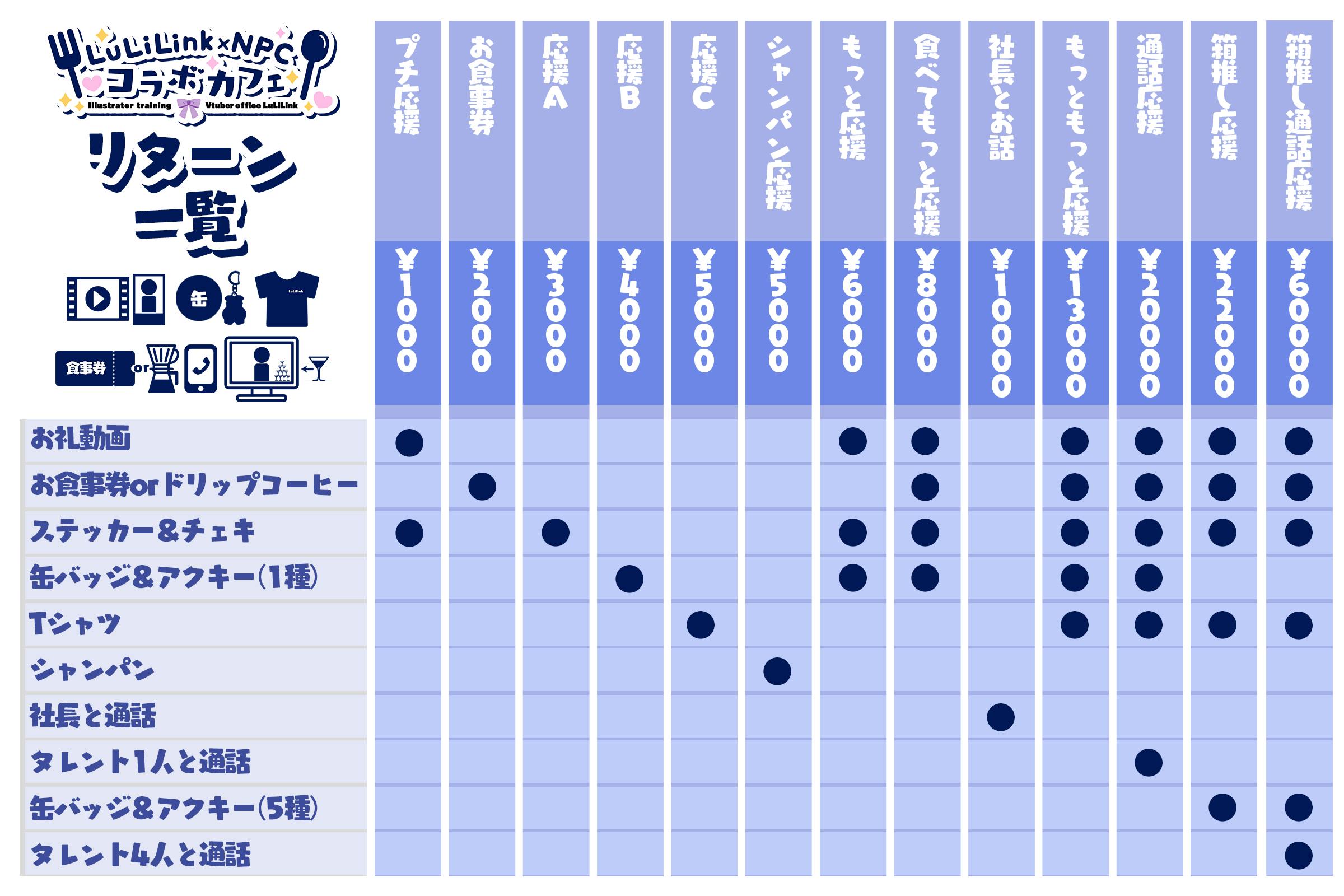 全プラン共通でLuLiLinkコラボカフェ開催記念公式放送内にてクレジット表記&お名前呼びを行います。