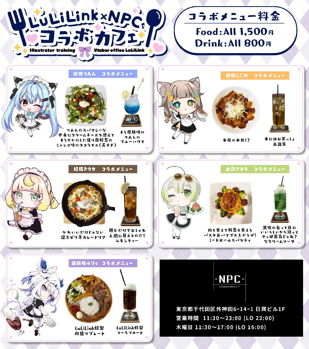 コラボメニューは「尾幡りあん」「穂俵こごめ」「絵描ウタ」「此朶アキラ」それぞれが考案した5つの食事、5つのドリンクのほか、LuLiLinkイメージキャラクターのルリィちゃんメニューを足した全5種の食事+ドリンクとなります。
