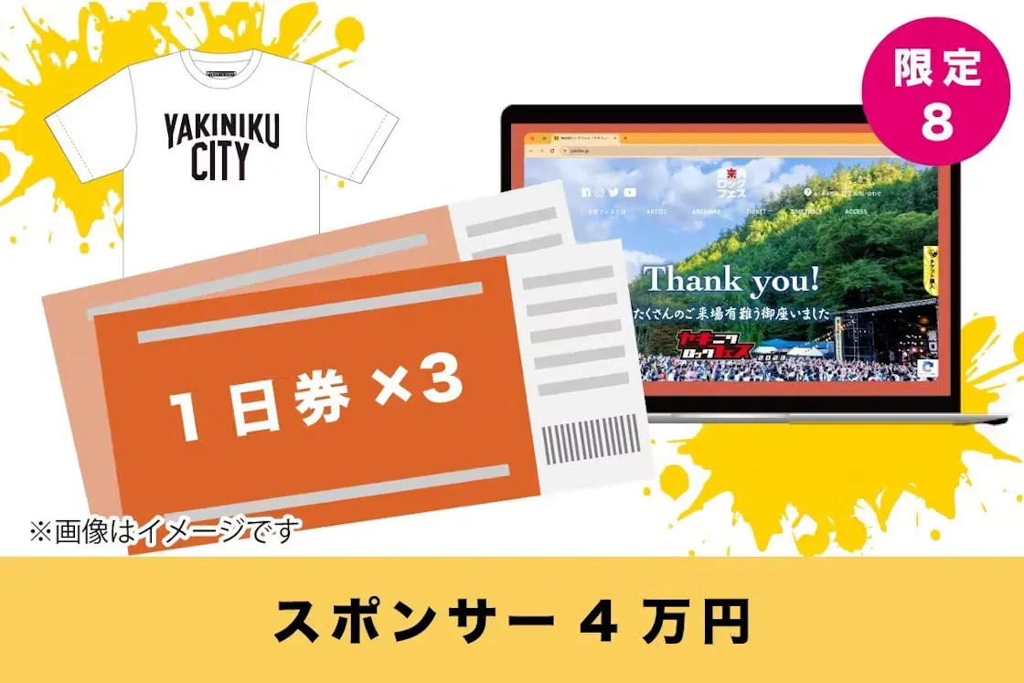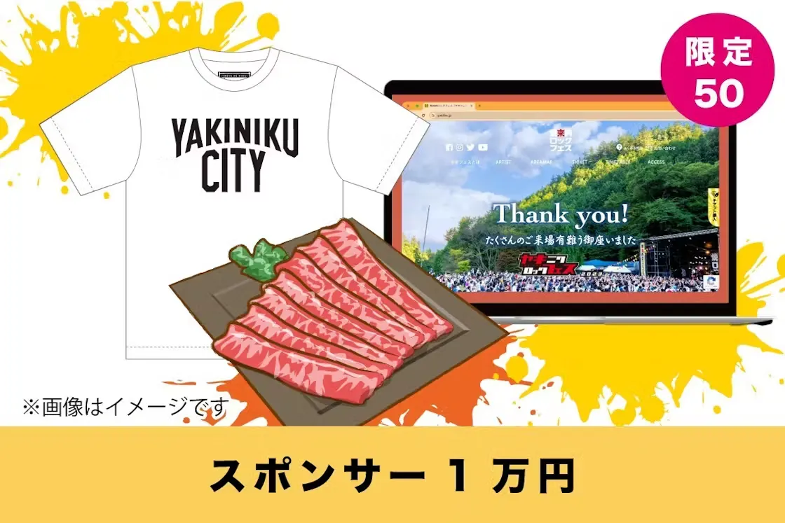 音楽と焼來肉ロックフェスを楽しんでいただけるスポンサーリターンをご準備しました。用意したTシャツはオリジナルグッズとなりますので、一緒に焼來肉ロックフェスを作り上げる感動を楽しんでいただけるものとなると思います!