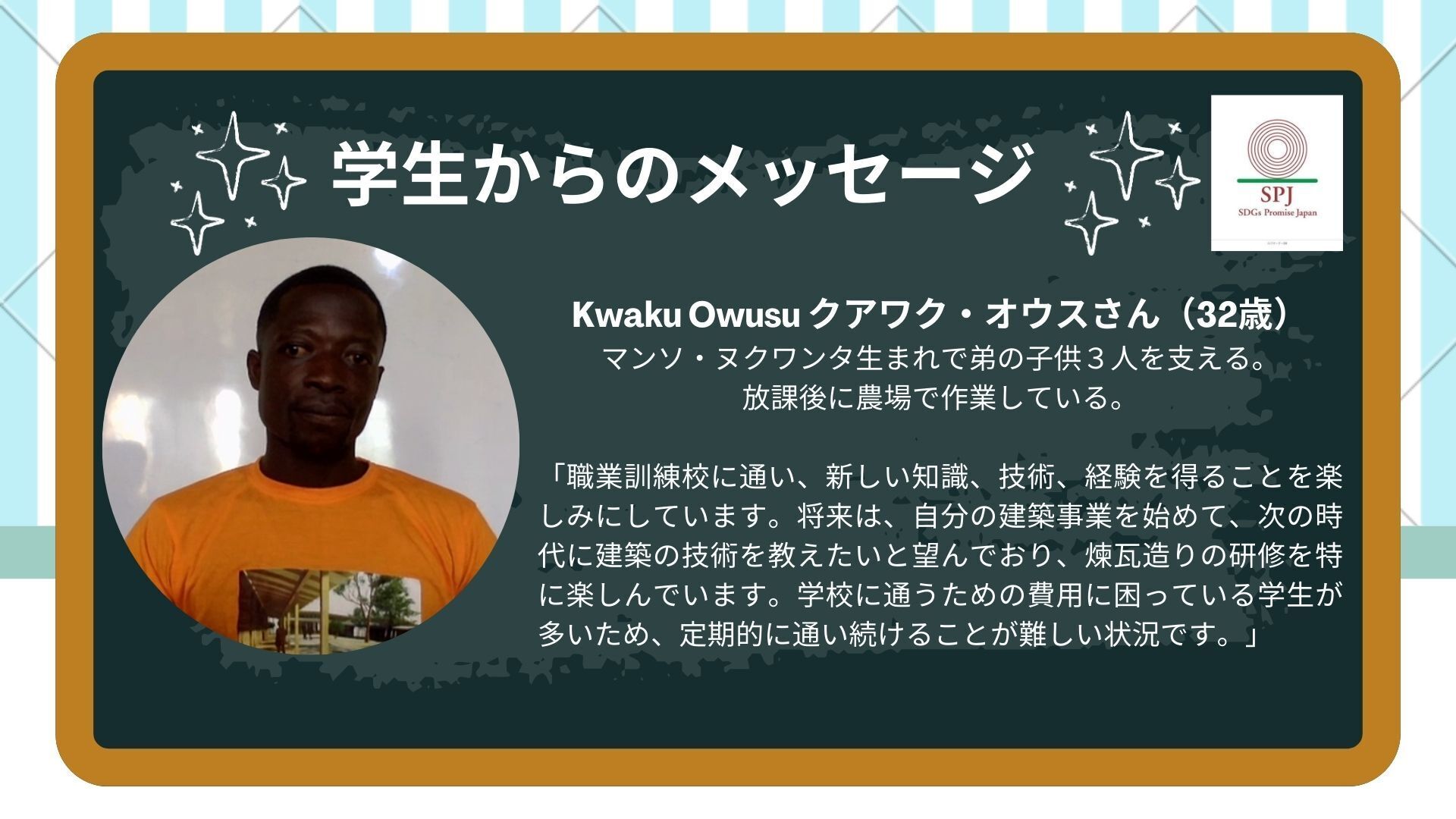 実際に職業訓練校に通う5名の学生が、学校で学んでいることや将来の夢などを語ってくれました!日本で学生と言えば、20歳前後の人を一般には想像するかと思います。しかし、ガーナでは中学校までの義務教育はほとんどの人が受けられますが、より高いスキルが得られる高等教育については、貧困などから一部の人しか受けることができません。メッセージを頂いた5人の内2人は30歳を超えています。皆さんからいただいたご支援で、学び始めるのは何歳になってからでも遅くないことを体現してくれます!そして、それが将来の貧困からの脱却につながります!
