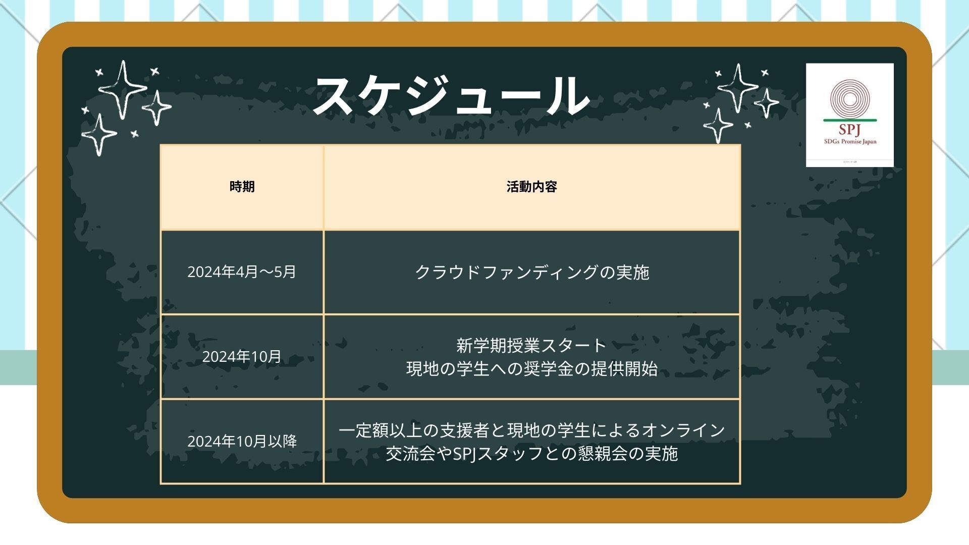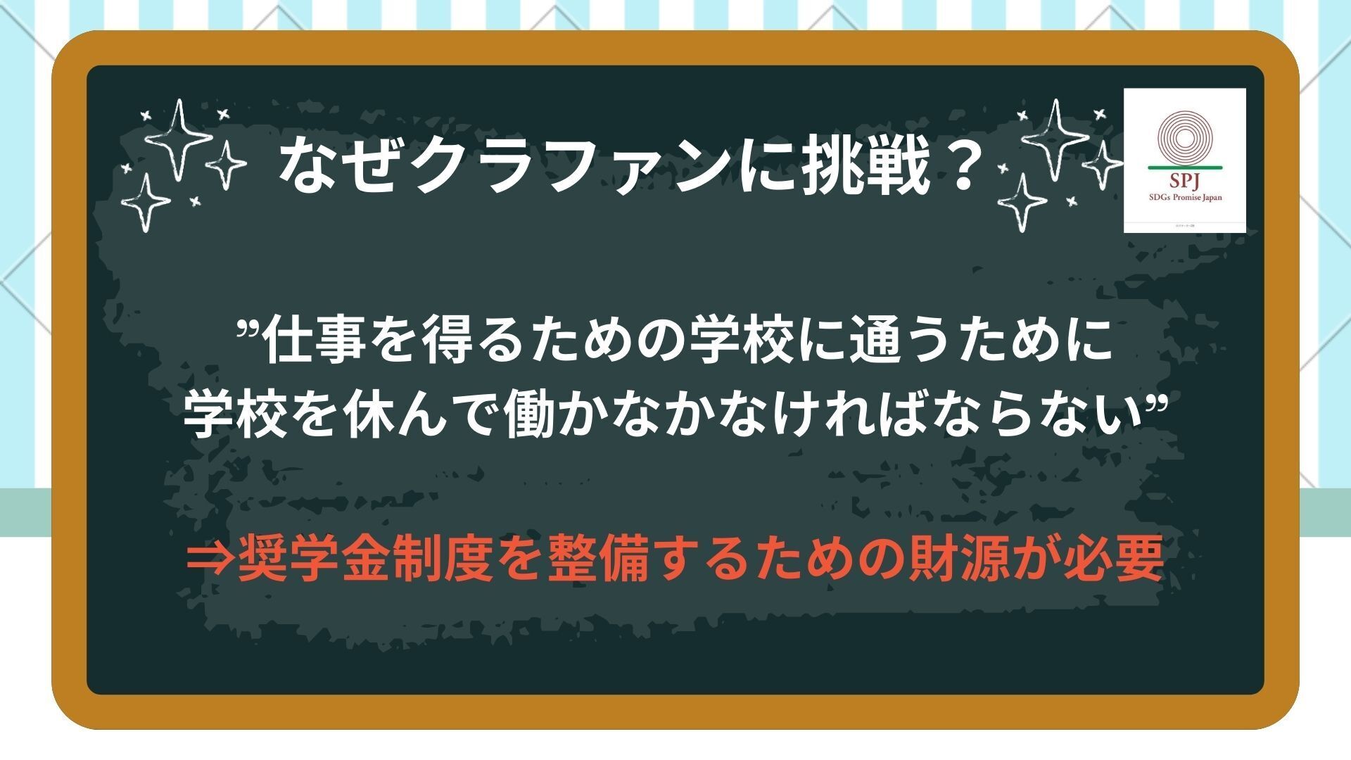 日本政府からのODA資金は学校建設に充てられています。しかしそれだけでは資金が足りず、先生たちに十分な給料が払えず、また学生たちの教科書代、交通費、昼食代などの補助をすることができません。そのために学生は学校へ通うために簿給の仕事でも学校を休んでまで働くのです。クラウドファンディングで頂いた資金を通じて、奨学金制度を創設し、学生への金銭的なサポートを実施していきます。