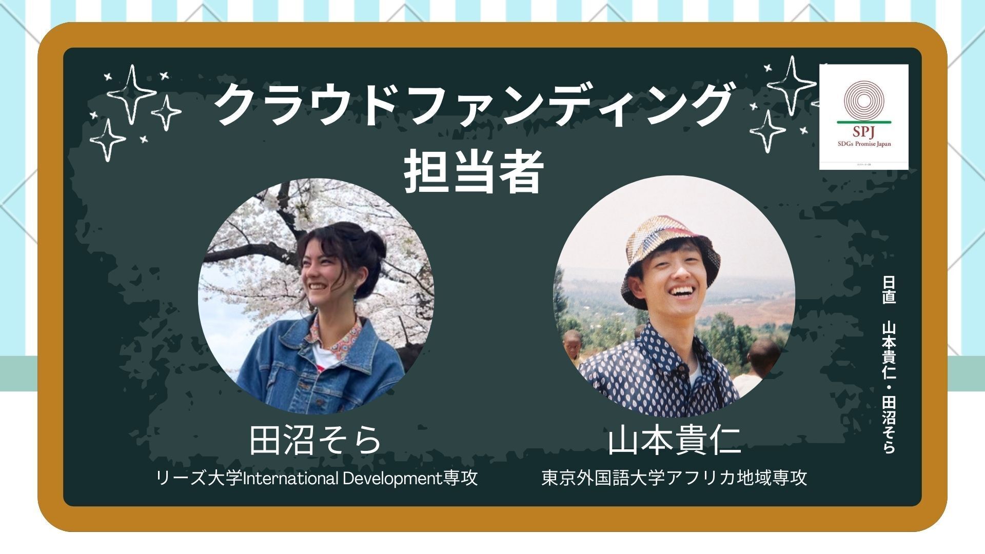 本クラウドファンディング担当は、SPJでインターンをしております東京外国語大学アフリカ地域専攻の山本貴仁とリーズ大学International Development専攻の田沼そらです!ともに今年の夏以降順次ガーナ大学への留学を予定しており、ガーナの人たちと共に、現地の視点を最重要としてプロジェクトを進めていきます!