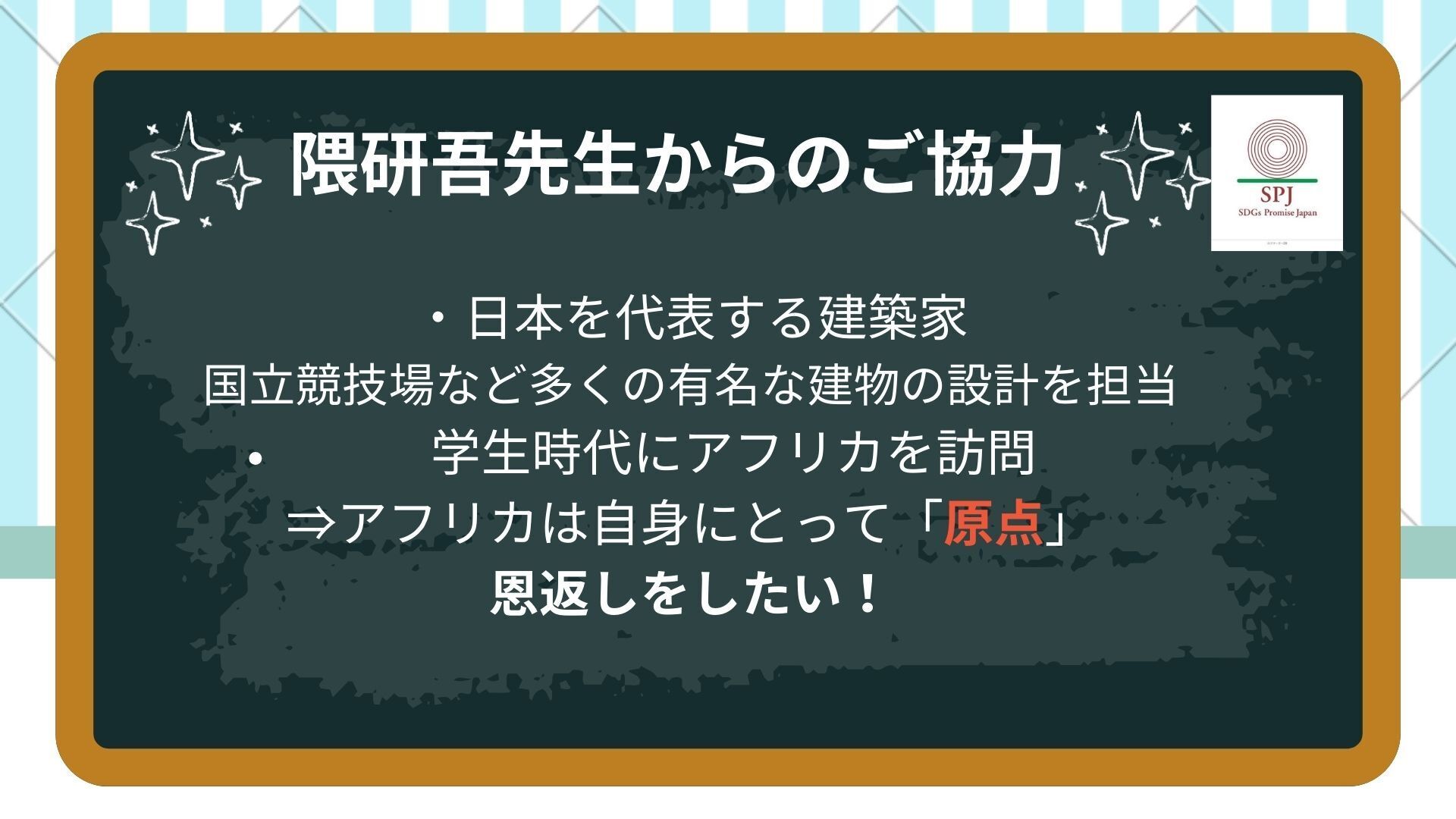 本クラウドファンディングは認定NPO法人であるSPJにご寄附を頂くという形になります。そのため、商品価値のある返礼をさせていただくことはできませんが、ご支援いただいた皆様に少しでもガーナに関心を持っていただけるようなバラエティに富んだ返礼をご用意しました!ご寄附額に応じて、様々な返礼を受け取る(参加する)ことができます。多額のご支援を頂いた場合、隈研吾先生や各界で活躍されるSPJの理事の皆さんとのランチ懇親会にもご参加いただけます。
