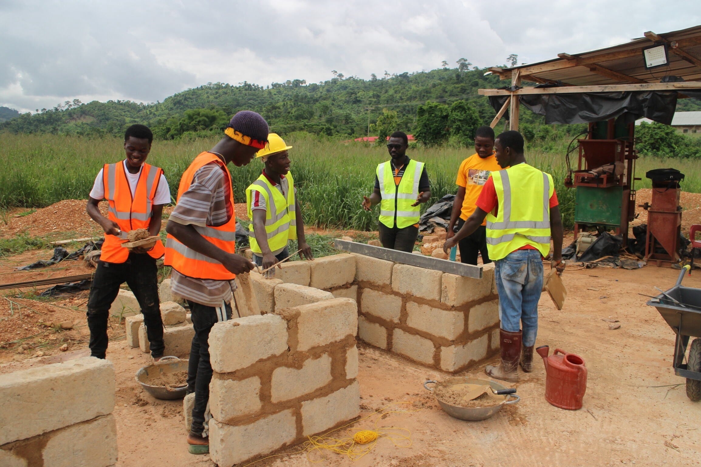 本事業は、前述のように、日本の外務省NGO連携無償資金協力、すなわちODA事業として実施されています!ガーナはかつてイギリスの植民地支配を受けていたころ、「ゴールドコースト」(金の海岸)と呼ばれるほどで、現在でも金の生産が盛んです。本事業のプロジェクト地、ガーナ共和国アシャンティ州アマンシ マンソ・ヌクワンタでも金の生産は活発に行われています。しかし、近年金の違法採掘や環境汚染などが深刻な問題となり、ガーナ政府は2017年に小規模な金採掘を規制しました。ただ、金鉱関連の労働者が非常に多かったこの町では、多くの若者が失業することになりました。そこで、地元の伝統的な指導者やNGOなどが中心となって若者のための施設を建設するため、SPJに協力要請がありました。その結果、18歳から35歳までの若者を対象に、石工、大工、排水管理や雨水利用などを含む配管・タイル工事に重点を置いた職業訓練校を設立・運営することにしました。建設用地は地域の伝統的指導者から提供された22ヘクタールの土地が利用されています。