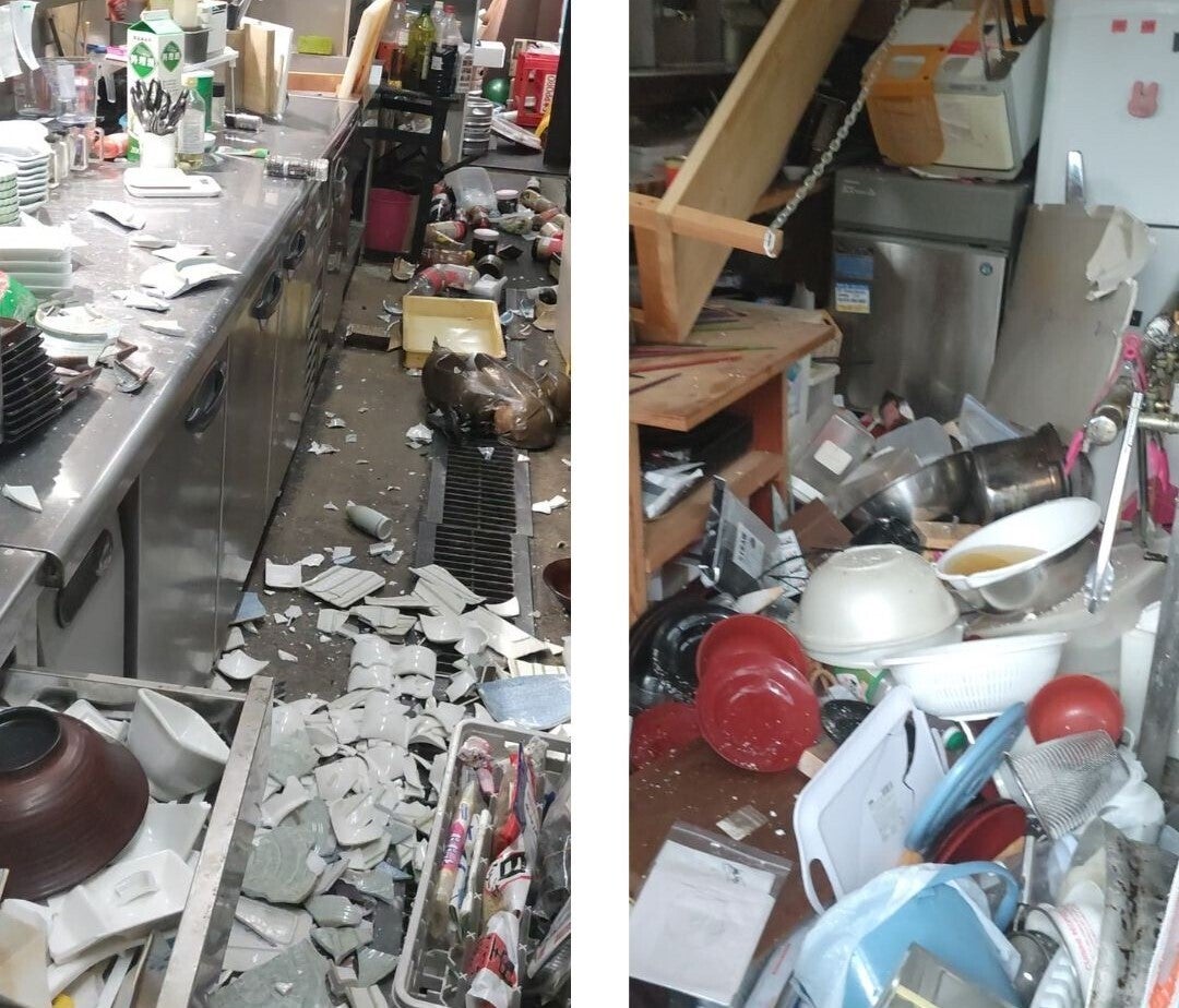 七尾市(和倉温泉街)の居酒屋は無事でした。店内のお皿や飲物のビン類が殆ど割れてしまいテーブルや椅子が転がっており、建物の外周はコンクリートが割れたり波打ったりしていますが、 幸いにも建物は大丈夫でした。