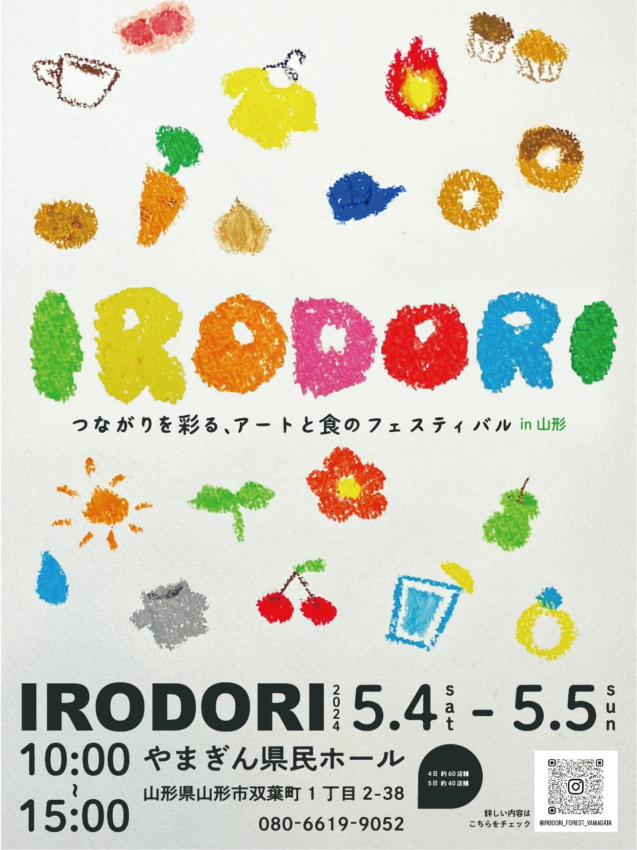 私は山形市で食とアートがコラボするフェス “IRODORI” を2024年5月4日・5日 の2日間にわたり、やまぎん県民ホールで開催します。地元の飲食店と地元のアート作家さん、その作品を販売する人たち、ありとあらゆる山形の資産を一堂に会し、県内外の人たちに皆さんの活動を通して山形の素晴らしさを知ってもらうイベントです。