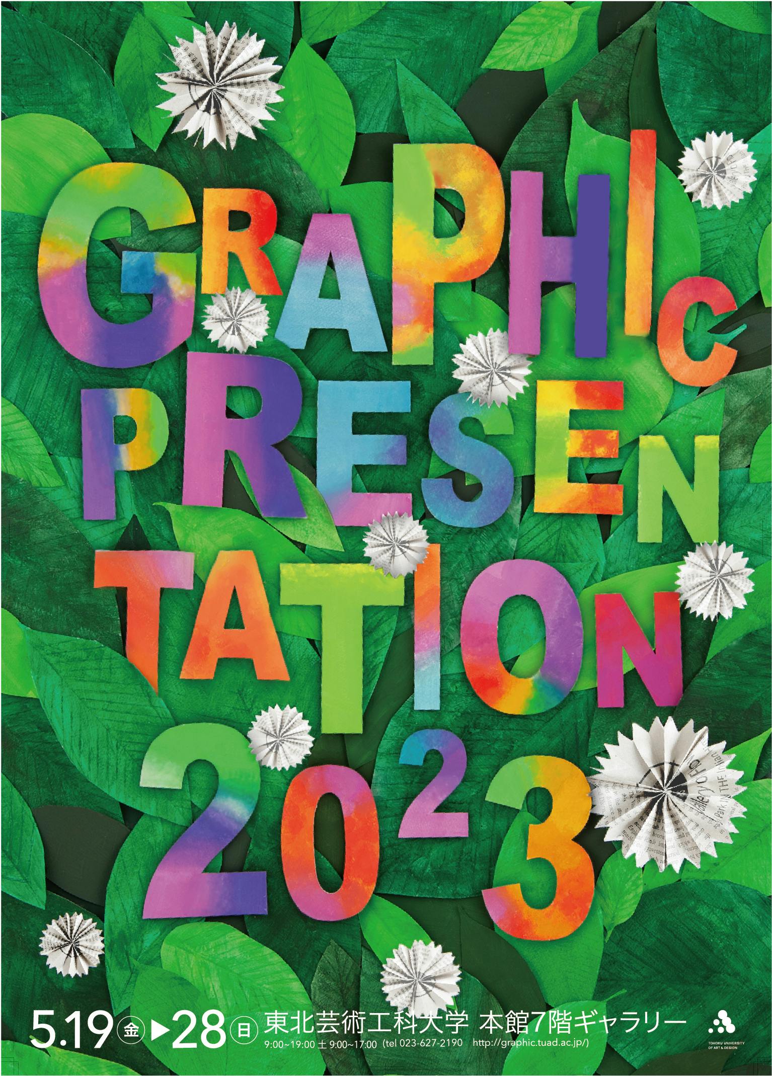 PCを使わず手で制作した原画を、後にデジタルで加工をするというポスター課題です。私は画用紙と水彩のような表現を使って緑の葉っぱを作り、私が思う東北芸術工科大学グラフィックデザイン学科の世界線を作りました。