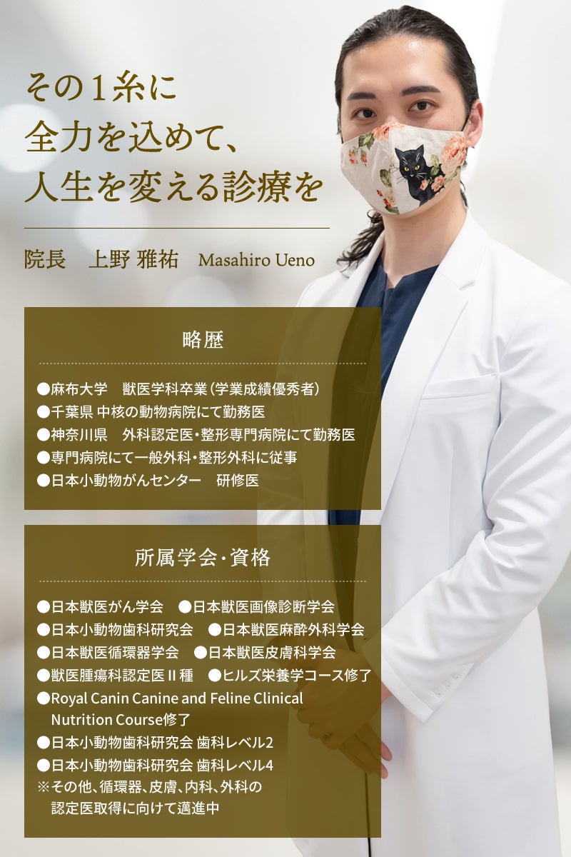 院長の上野は獣医腫瘍科認定医であり、循環器、整形外科についても専門医のもとで修養を積み重ねてきました。