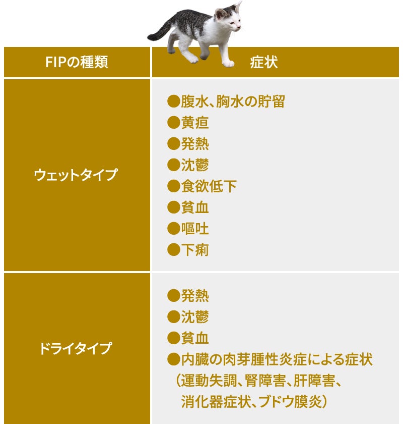 そんなFIPは、症状によってドライタイプとウェットタイプの二種類に分けられ、(またその混合型も存在するなど)様々なケースが見受けられます。