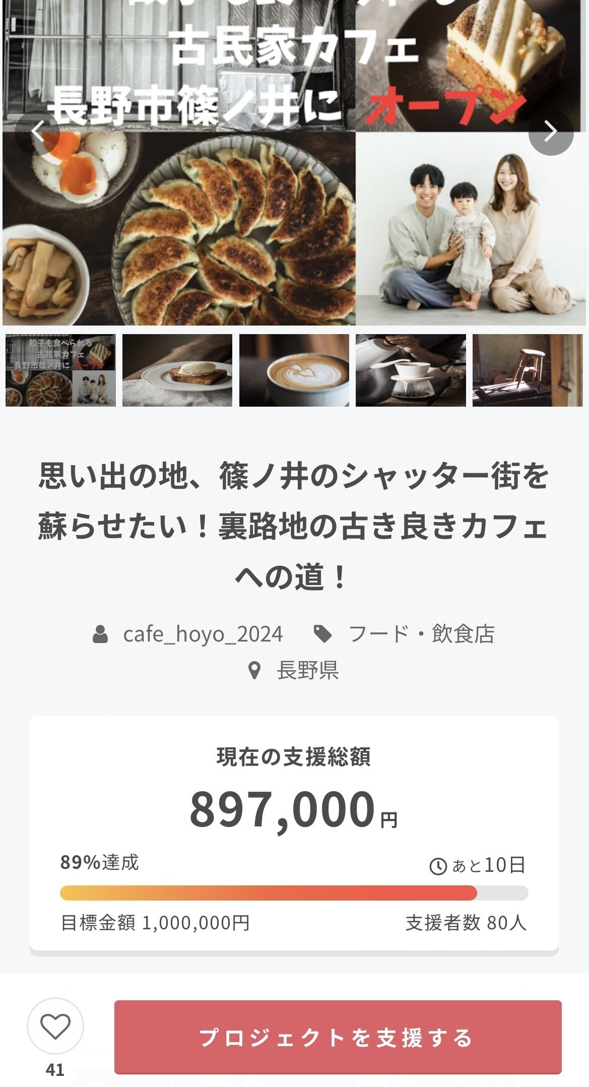 こんにちは!本日プロジェクトの最終日となります!今までご支援いただきありがとうございます!インスタでも楽しみにしています等、温かいお言葉ありがとうございます!大変嬉しく思っております!また篠ノ井を盛り上げたいと思っている方も多くいることを知りとても心強く感じています!本日ですが、実家に眠っていた棚を綺麗にし、搬入しました!飾り棚として店内に配置予定です!物件もそうですが、昔のものを蘇らせるワクワク感はやはりいいですね!経年ととも出る味があってとても好きです!さて本日最終日にはなりますが、ネクストゴール目指しています!諦めずにいきたいと思いますのでご支援と周りの方への拡散もよろしくお願いします!!オープン後皆様にお会いできる日を楽しみにしております。