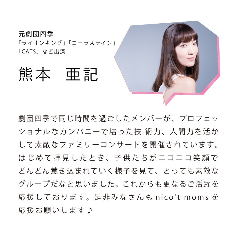 現在は、4歳男の子のママをしながら、2022年に元劇団四季ママ達3人でnico't moms(ニコットマムズ)というグループを結成し、ファミリーコンサートを開催しています。