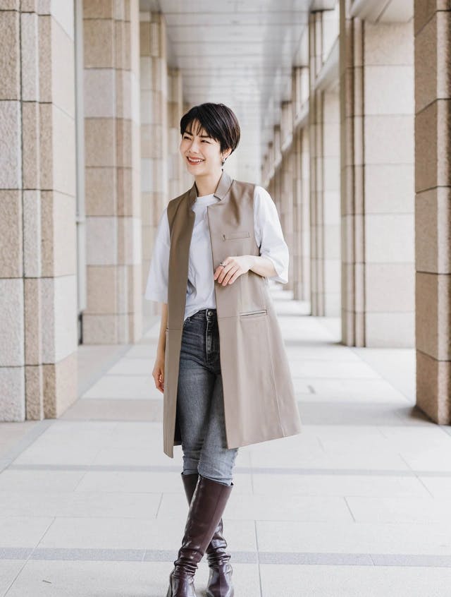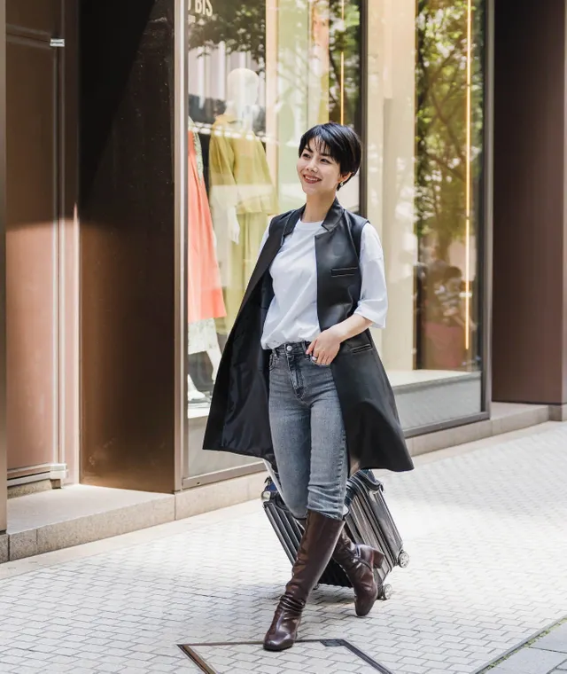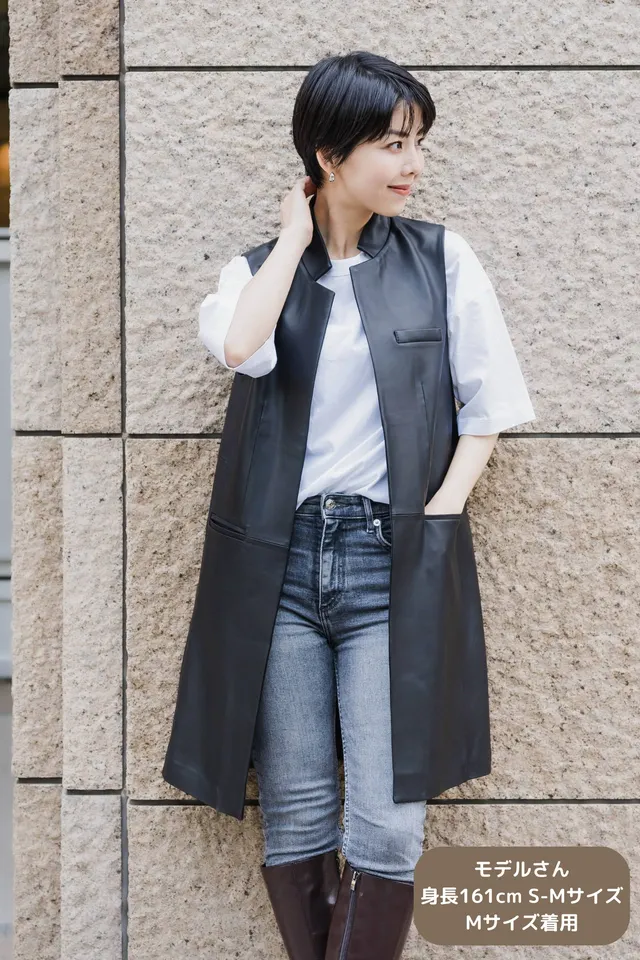 レザーコートを黒にしてしまうとハードになりますが、ジレだと前たてや袖からインナーが見えるので中和されます。