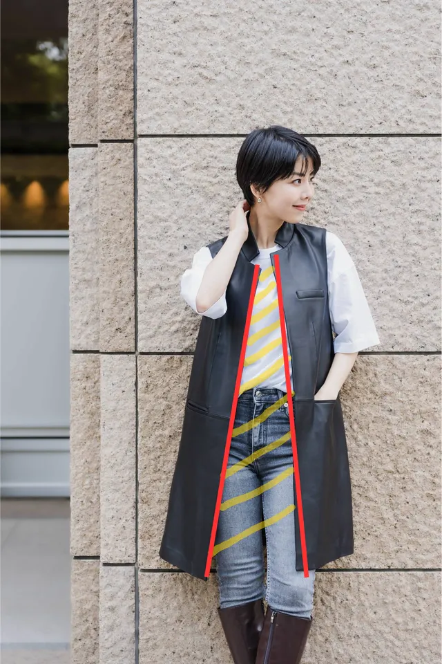 完全に隠してしまうのではなく、タテのライン(赤のライン)を見せるとインナーの部分だけが視覚的に見えてくるので(腹部~ヒップ~太ももの外側が削られて見える感覚)すっきり見えるのです。