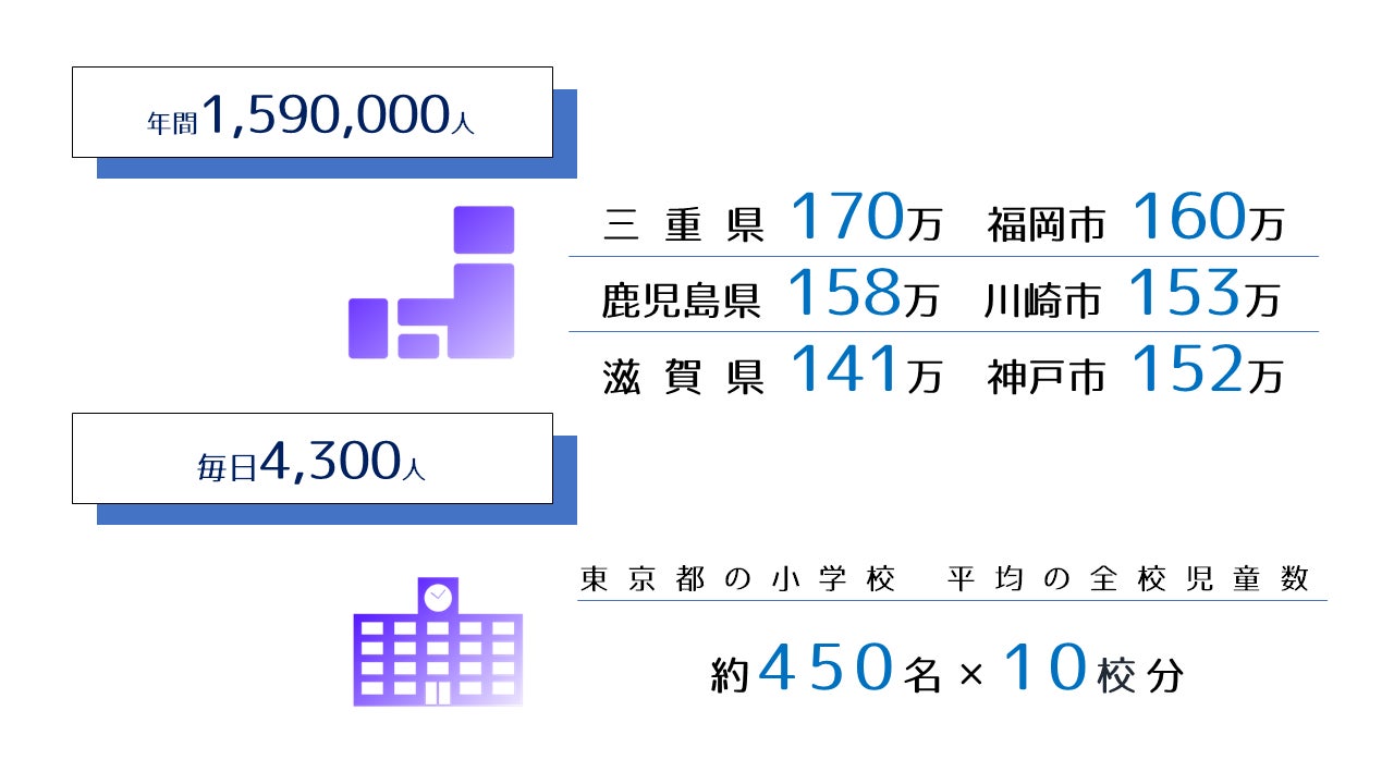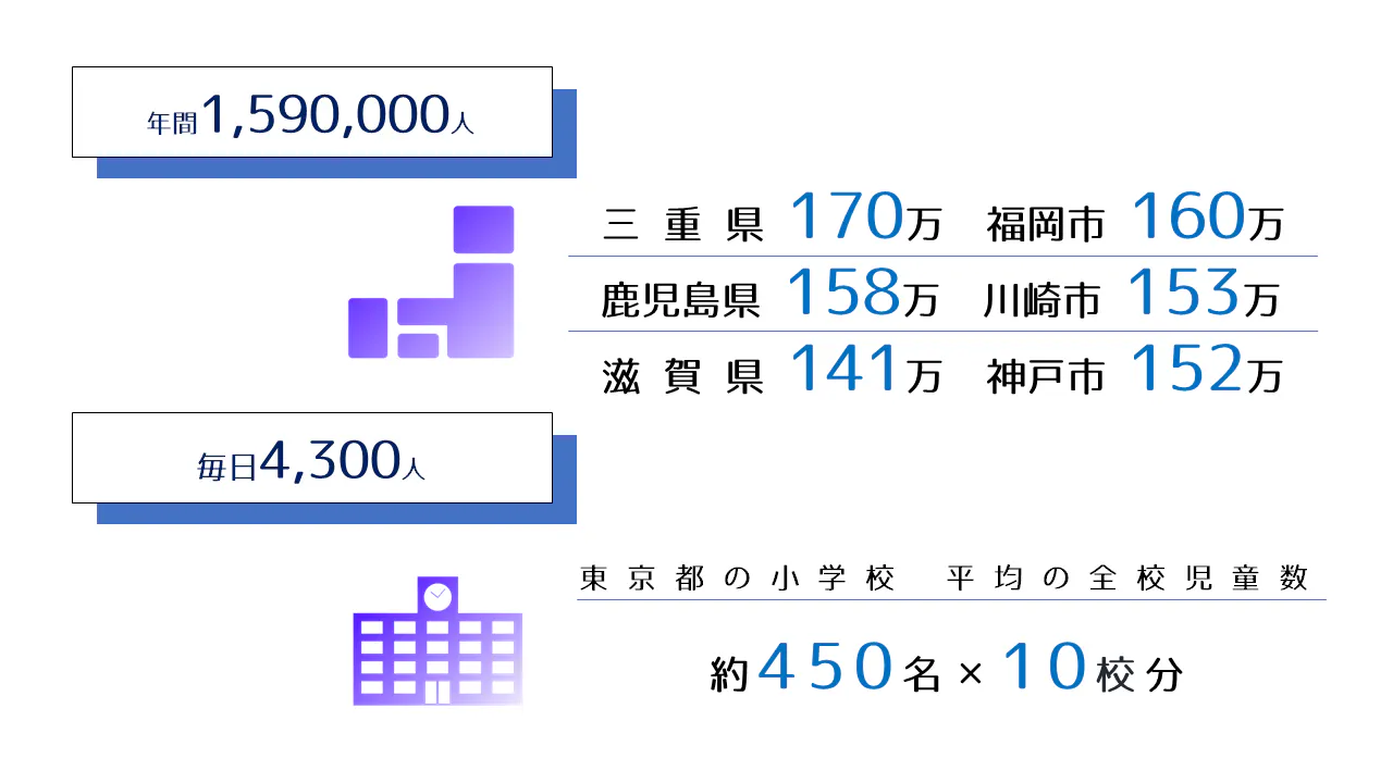 159万人(毎日4,300人)と言えば、単一都道府県の人口、あるいは栄えている政令指定都市の人口に匹敵します。この数の方々が、1年間で日本から消えているのです。