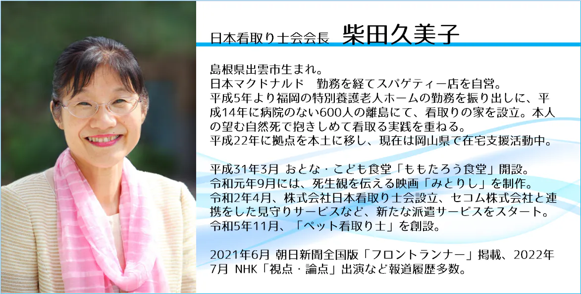 イベントでは自宅死についてとりあげた劇場用映画「みとりし」の上映と、当会代表で看取りの現場に30年携わり続けてきた「柴田久美子」の講演会を行います。