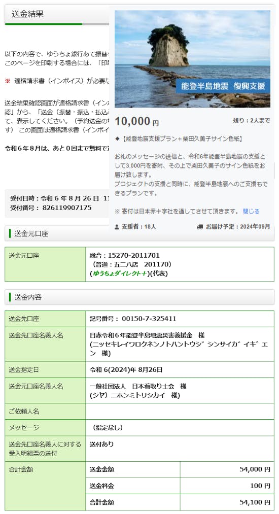 2024/08/26 13:06「能登地震支援プラン」 リターンで頂いておりました寄附金につきまして、3,000円×18名様=54,000円を本日付で日本赤十字を通して寄付させて頂きました。柴田久美子のサイン色紙も現在発送準備中です。今しばらくお待ちください。 もっと見る
