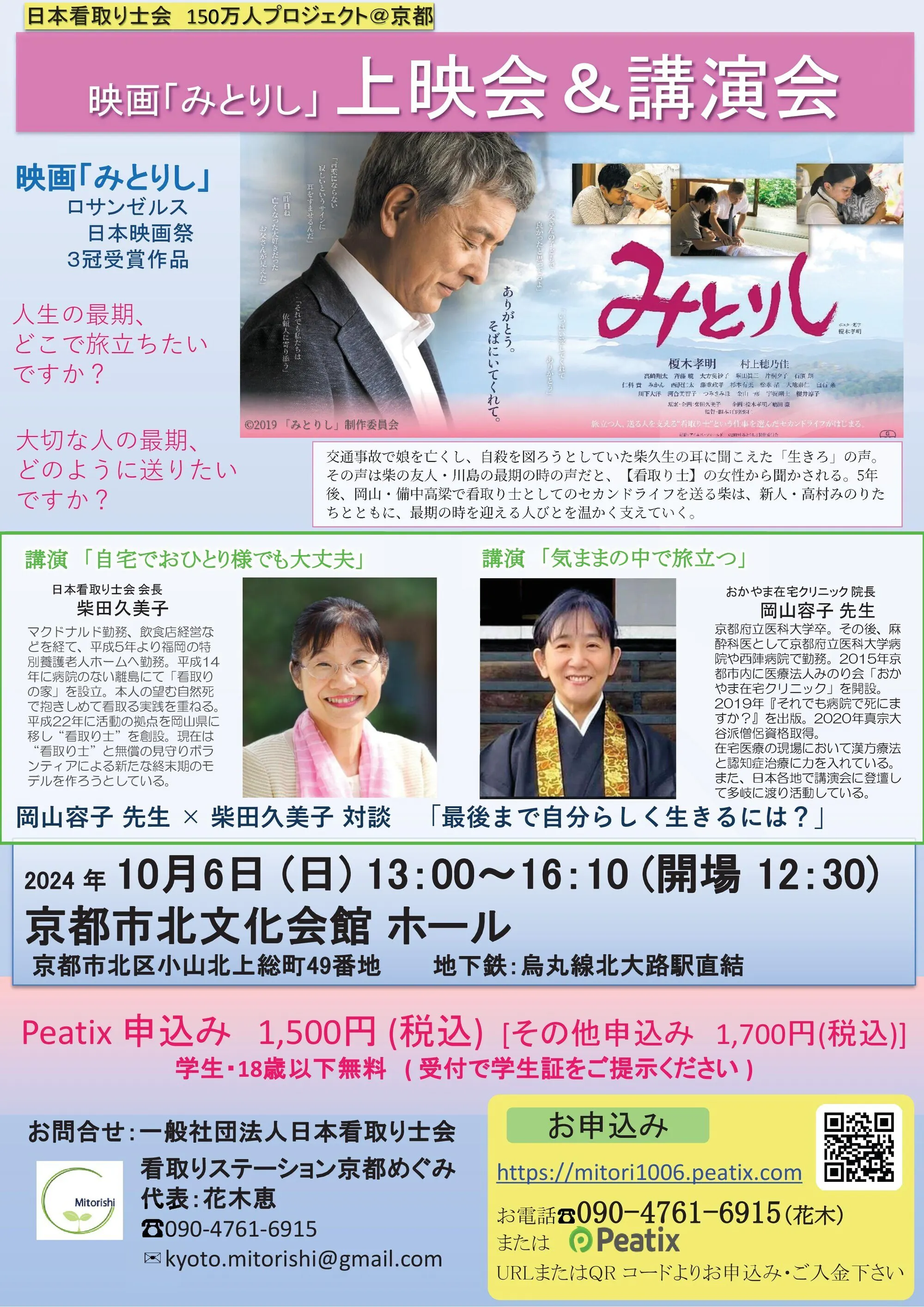 当日は「気ままの中で旅立つ」をテーマに、京都のおかやま在宅クリニック院長、岡山容子先生にご講演をいただき、岡山先生と当会会長の柴田久美子との対談も予定しております。