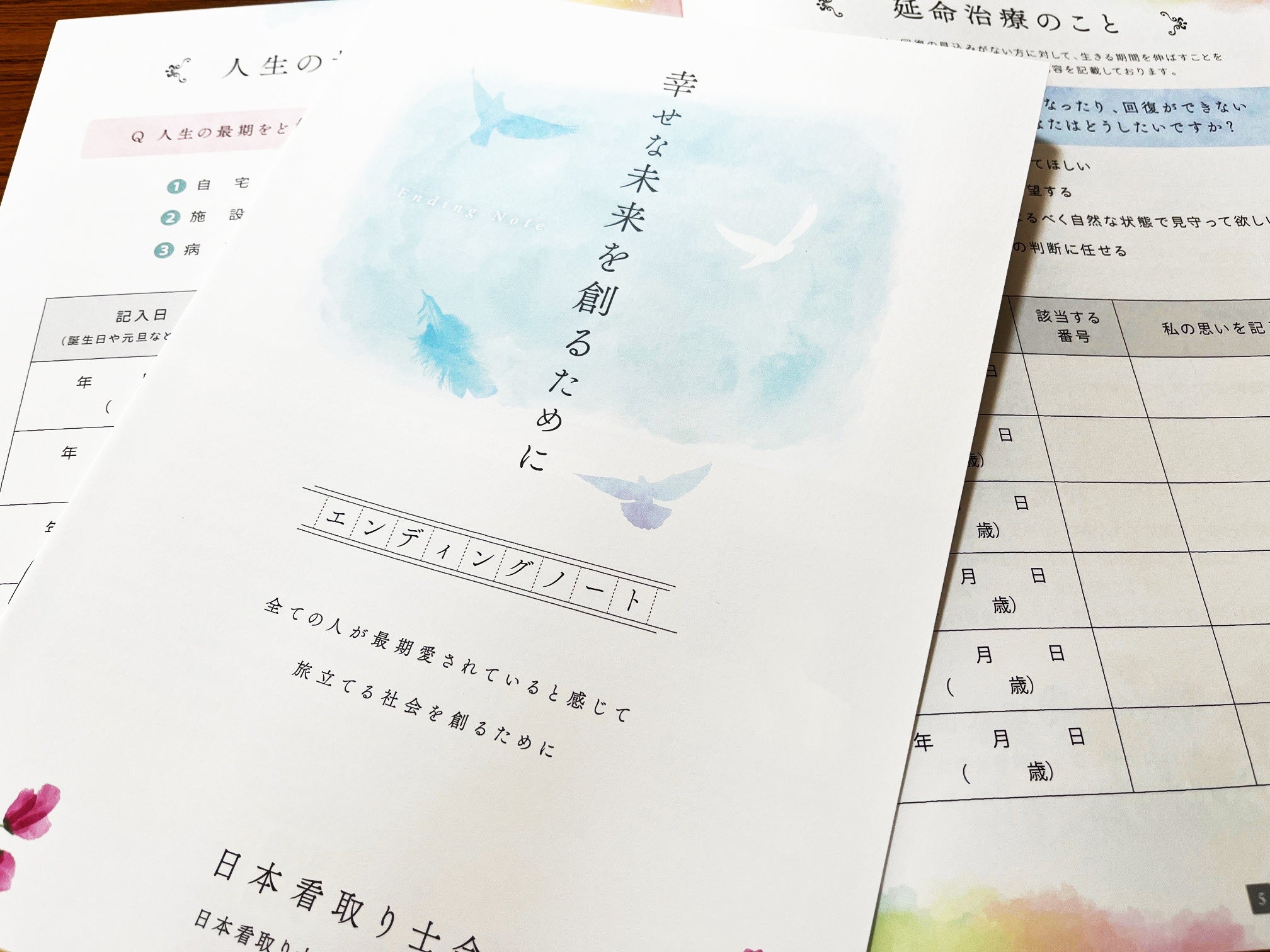 リターンに設定されているエンディングノートをご紹介します。このエンディングノートは、日本看取り士会10周年を記念して作られたものです。エンディングノートとは、自分が亡くなったときや意思疎通ができなくなったときに備えて、家族などに向けて必要な情報を書き残しておくためのものです。日本では1991年ごろから始まり、今では有料・無料、多種多様なエンディングノート(終活ノートとも呼ばれます)が広まっています。日本看取り士会のエンディングノートは、以下のような構成となっています。P2~ 私からのメッセージP4~ 人生の最後のことP5~ 延命治療のことP8~ 終末期についてP9~ 連絡先リストP10~ 葬儀のことP11~ 医療判断代理委任状このエンディングノートには、お金のことを書く欄は設けていません。「お金のことが書かれているから、大事に金庫に入れておかなきゃ」笑い話のようですが、そんなケースを防ぐためです。エンディングノートは、ただ記入して終わるものではありません。このノートを通じて、自分の最後の望みを家族や大切な人々に伝えることができます。記入することで、自分の人生の終わりをどのように迎えたいかを見つめ直し、周りの方々とその想いを共有することができます。また、なかなかきっかけがないと話せない最後の時の望みについて、ご両親にお尋ねになる際にもお使い頂ければ幸いです。