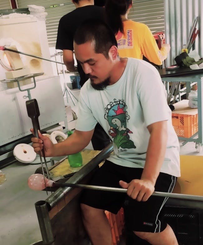 沖縄に帰国後、琉球ガラスの魅力に惹かれ、職人を目指し修行に励む。現在13年目。