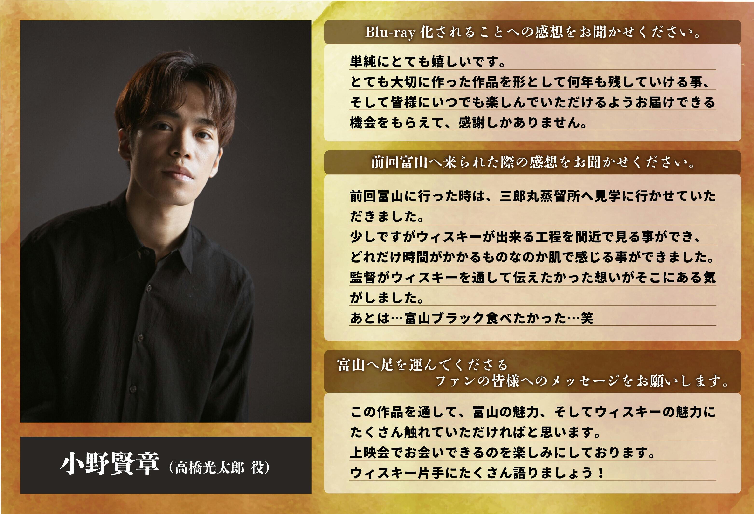 さて、11/10(日)開催の『駒田蒸留所へようこそ』生コメンタリー上映イベントin富山へご出演いただく、高橋光太郎役の小野賢章さんより、クラウドファンディングを応援してくださる皆様へのメッセージをいただきました!小野さん、お忙しい中誠にありがとうございます。このプロジェクトのために寄せていただいたメッセージです。昨年10/7に、全国劇場公開に先駆けて富山県砺波市のイオンモールとなみで行われた、トークショーで富山を訪れた際のことにも触れていただいています。それ以来の小野さんの富山県入り、私たちも今から本当に楽しみにしています!