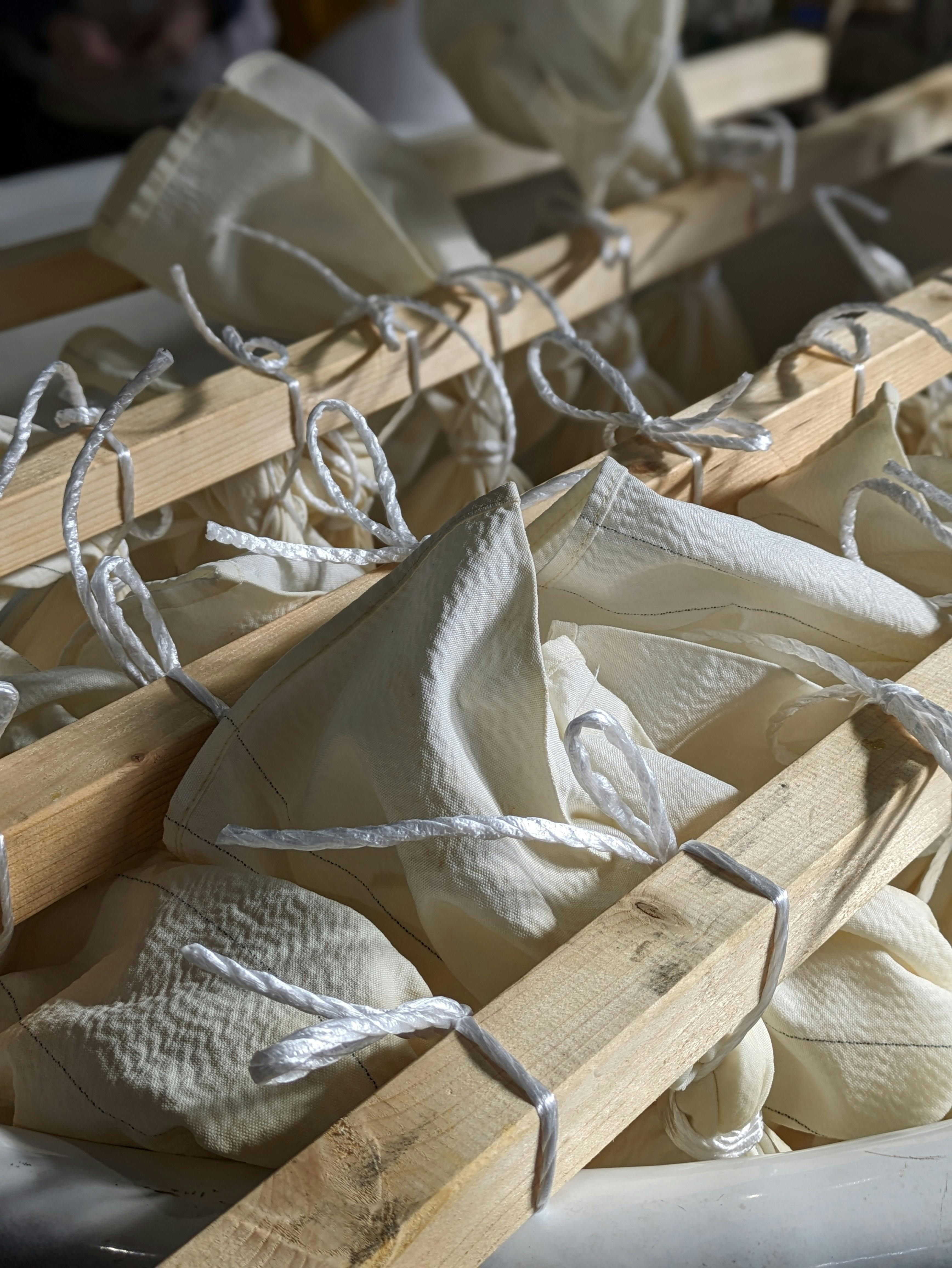 酒米は、兵庫県の山田錦や、石川県の五百万石を使用。麹菌によって糖化され、酵母によってアルコール発酵したもろみは酒袋に入れられ、袋吊りや、木槽しぼりで時間をかけてしぼります。これが澄み切った雑味の少ないお酒をつくりだします。