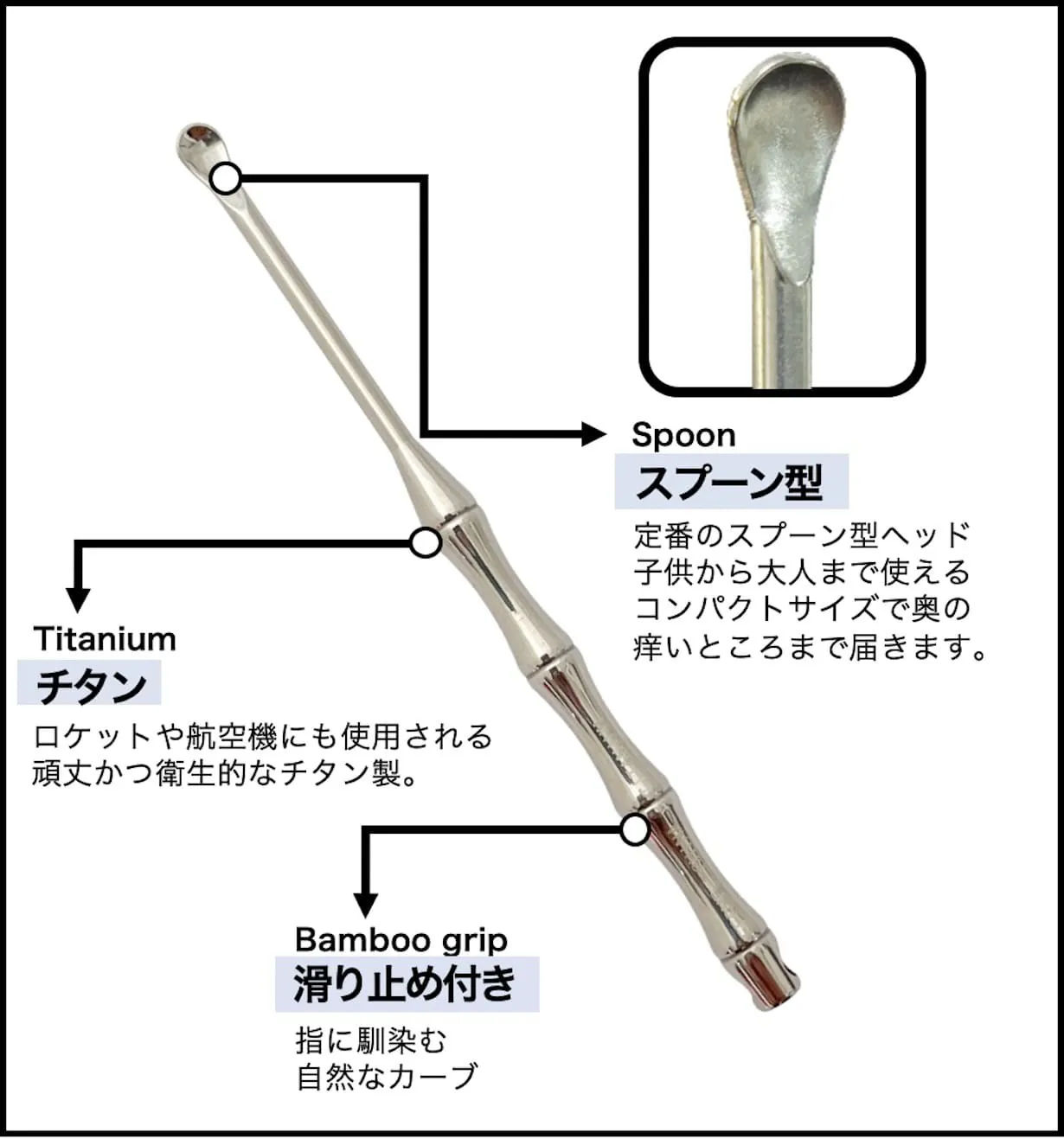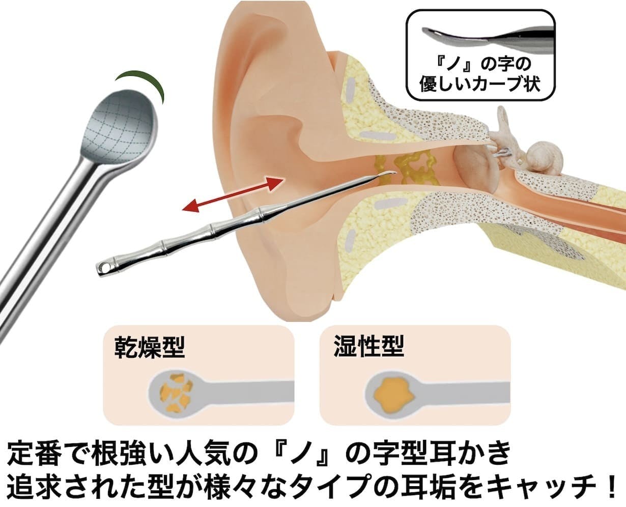 そして超定番であり根強い人気のチタン製スプーン型耳かきがすべての耳垢を綺麗に快適除去!
