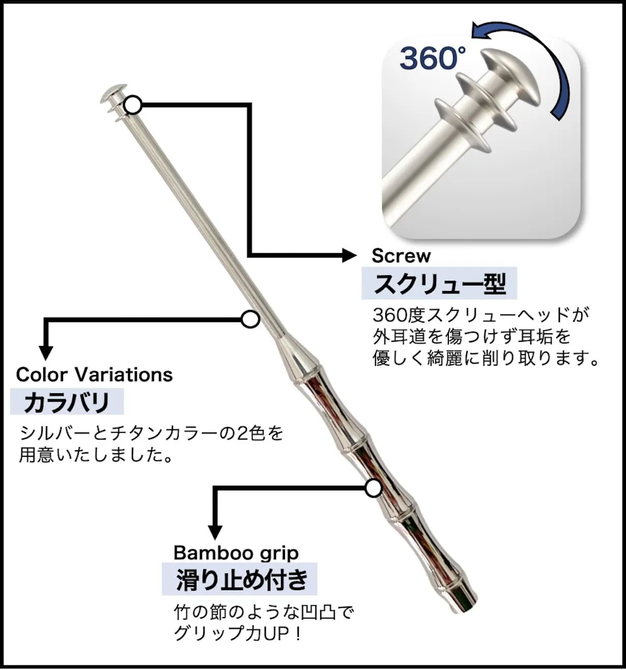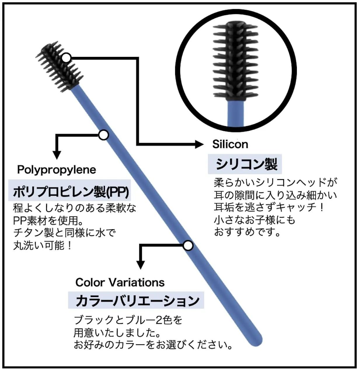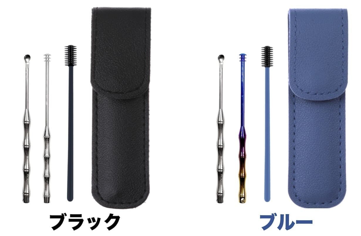 ※360°チタンイヤークリーナーのカラーはブラックは『シルバー』、ブルーは『チタンから(虹色)』です。