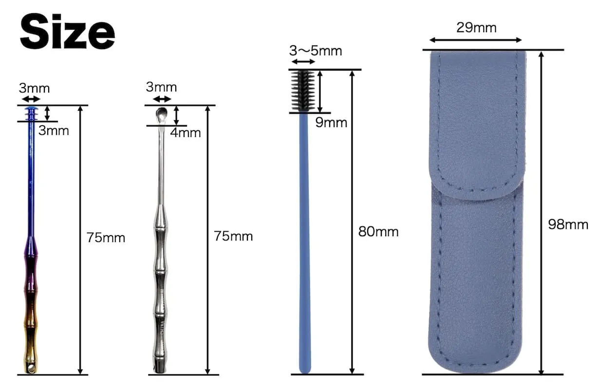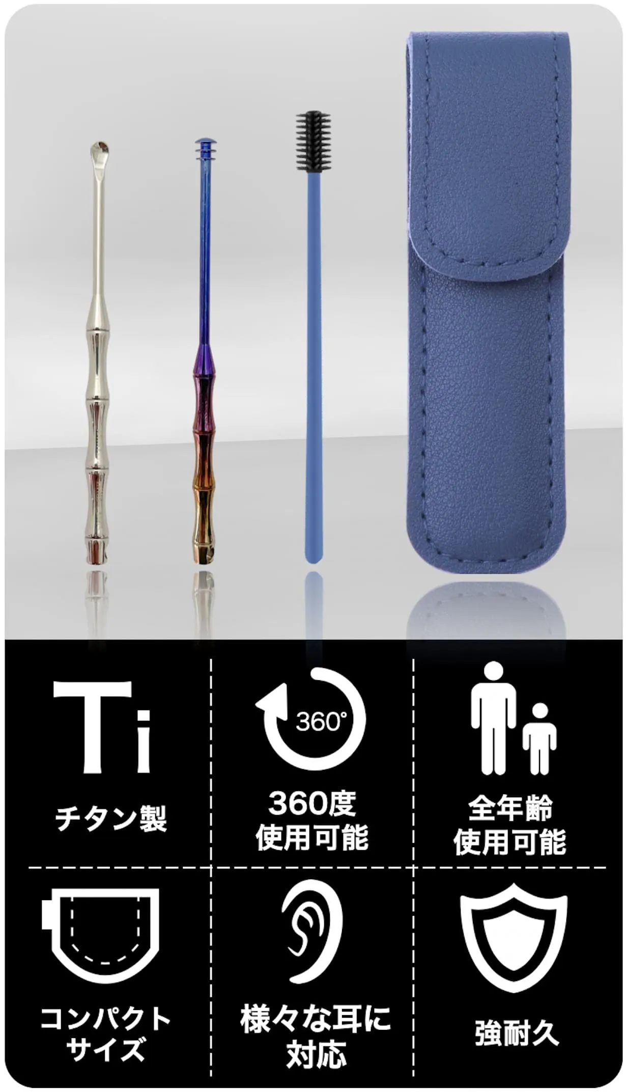 商品セット内容:360°チタン製イヤークリーナー棒、スプーン型チタン製耳かき、シリコンヘッドイヤークリーナー、レザーケース