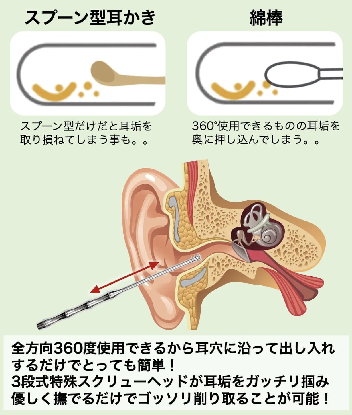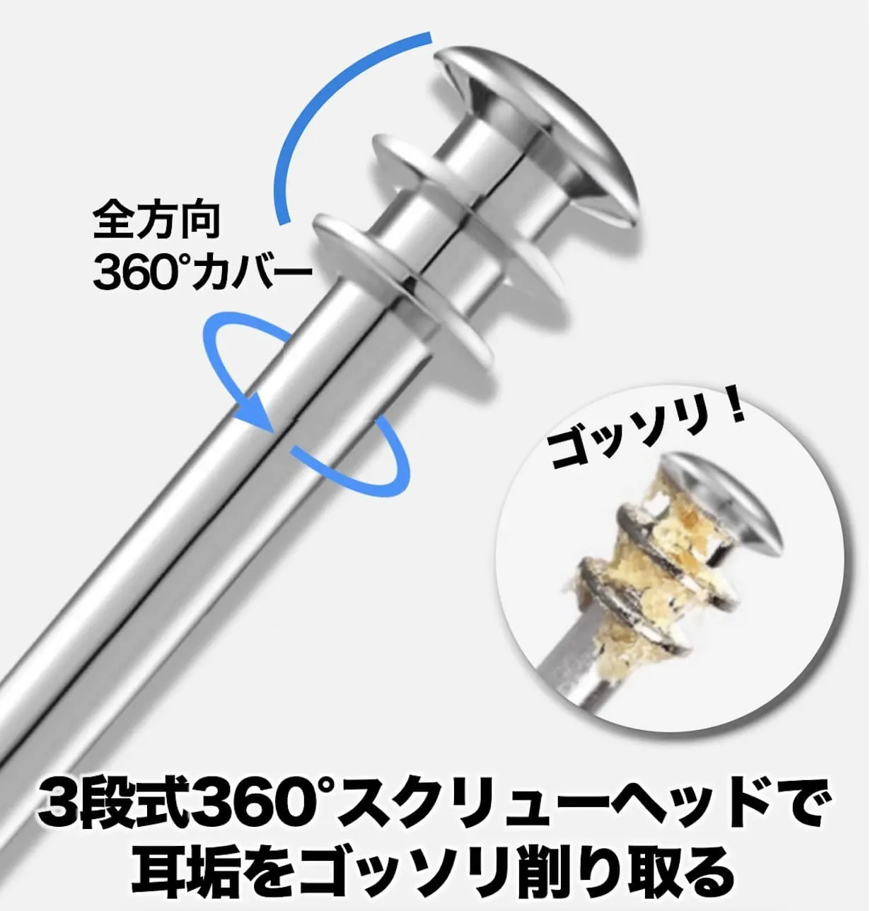 特殊な360度チタンヘッドで耳穴を撫でるだけで耳垢を削り取ることができます。