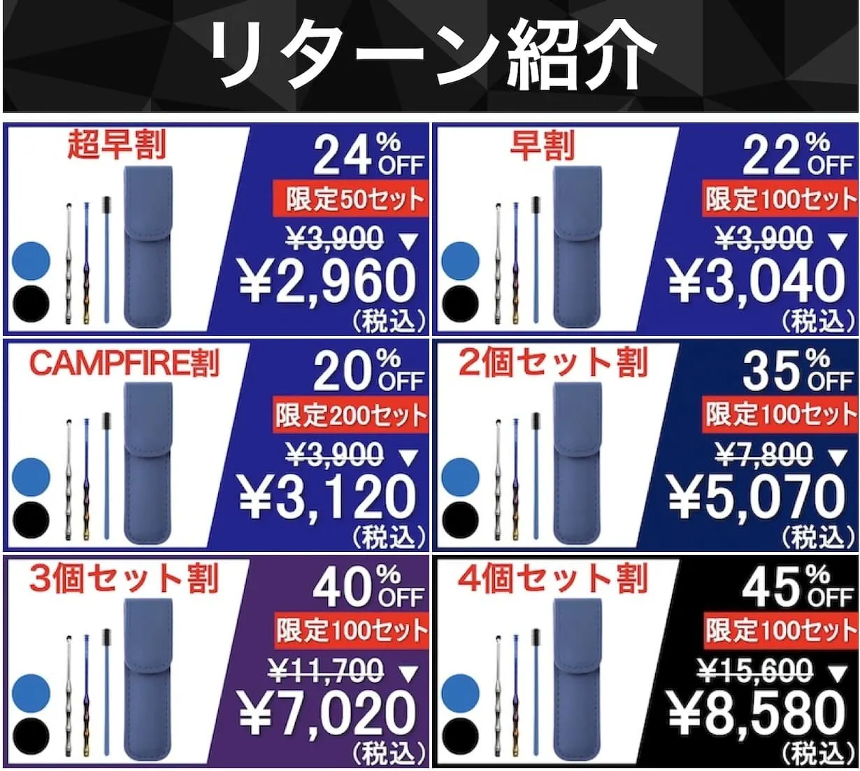 A.今回のプロジェクトはセット販売のみとなりますが、もしご要望があれば一般販売を開始した際にチタン製イヤークリーナーとシリコン製イヤークリーナーの別売りを行うことも検討いたします。