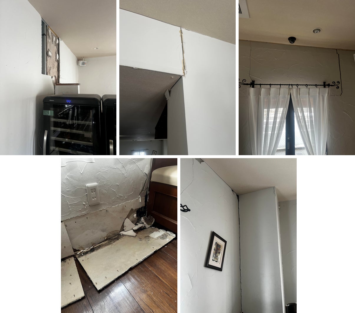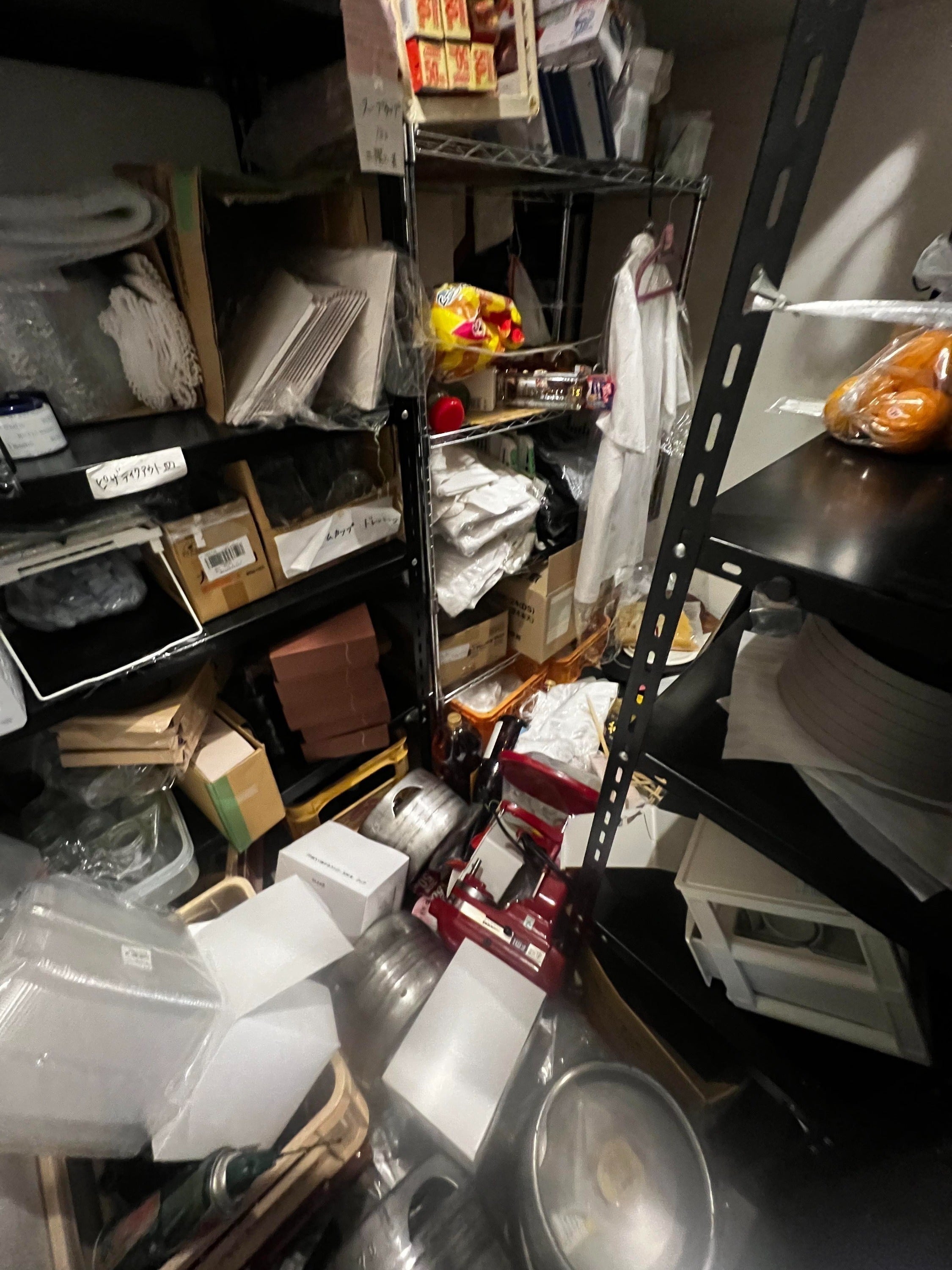 ▲外壁だけでなく内壁までもが剥がれ落ち、かなりの修繕が必要であることは一目でわかりました。大きな冷蔵庫も倒れ、大切に使ってきた作家さんの器やグラスもたくさん割れてしまいました。