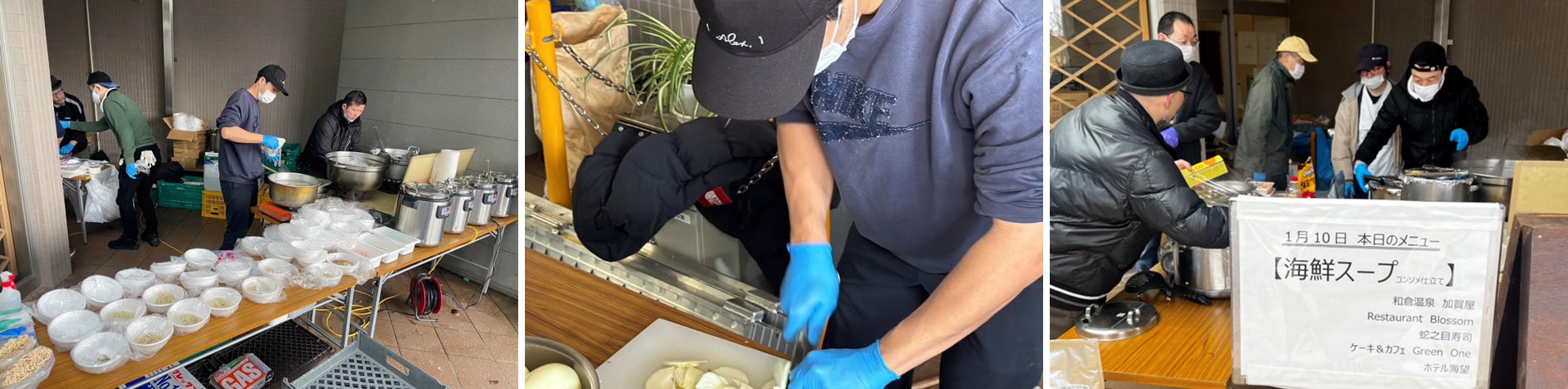 発災後1月6日から和倉の旅館や飲食店メンバーと共に始めた炊き出しは、水がなく、食材が限られていても、”料理は人を幸せにできる”と再確認し、「食とは希望だ」と改めて思えた体験でした。炊き出しに携わった料理人の絆は固く、自らも被災者でありながら率先して動く姿に、この街の希望を感じ、料理の力が人々を結びつけ支え合い、希望を生むことを知りました。だからこそ、まずは自分たち飲食店の復活が街の復興の大きな支えになると僕は信じています。