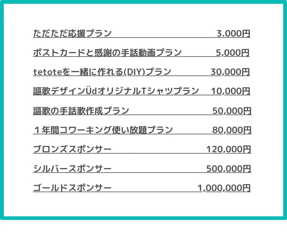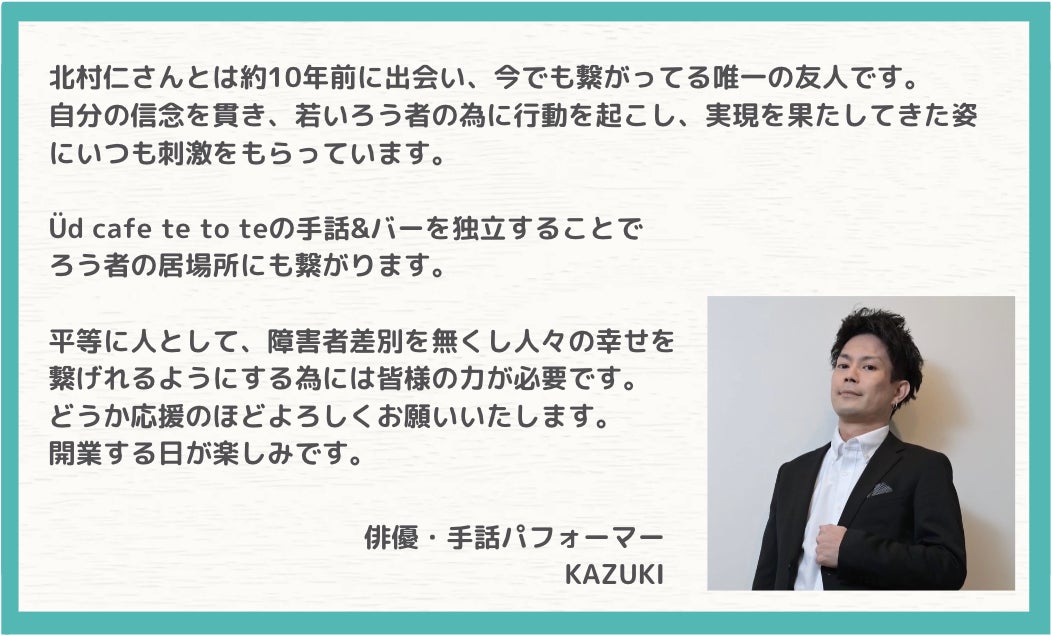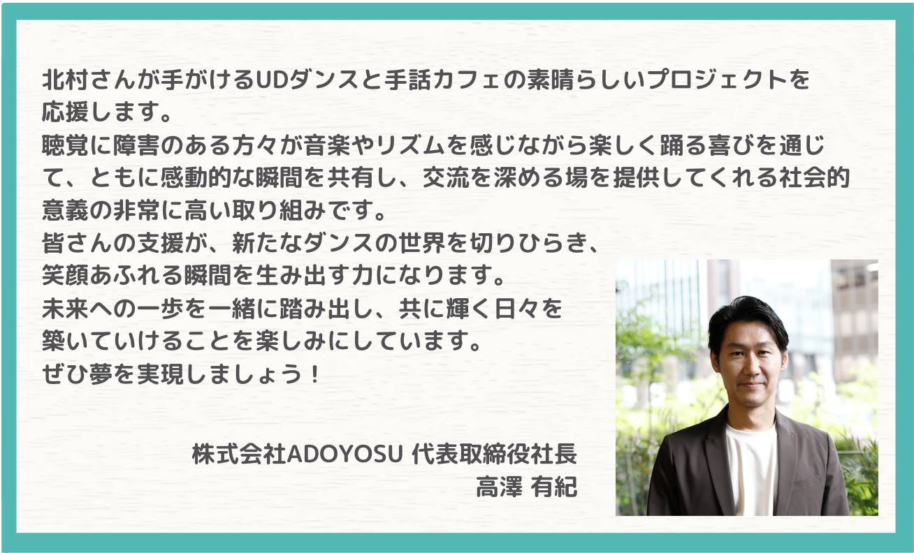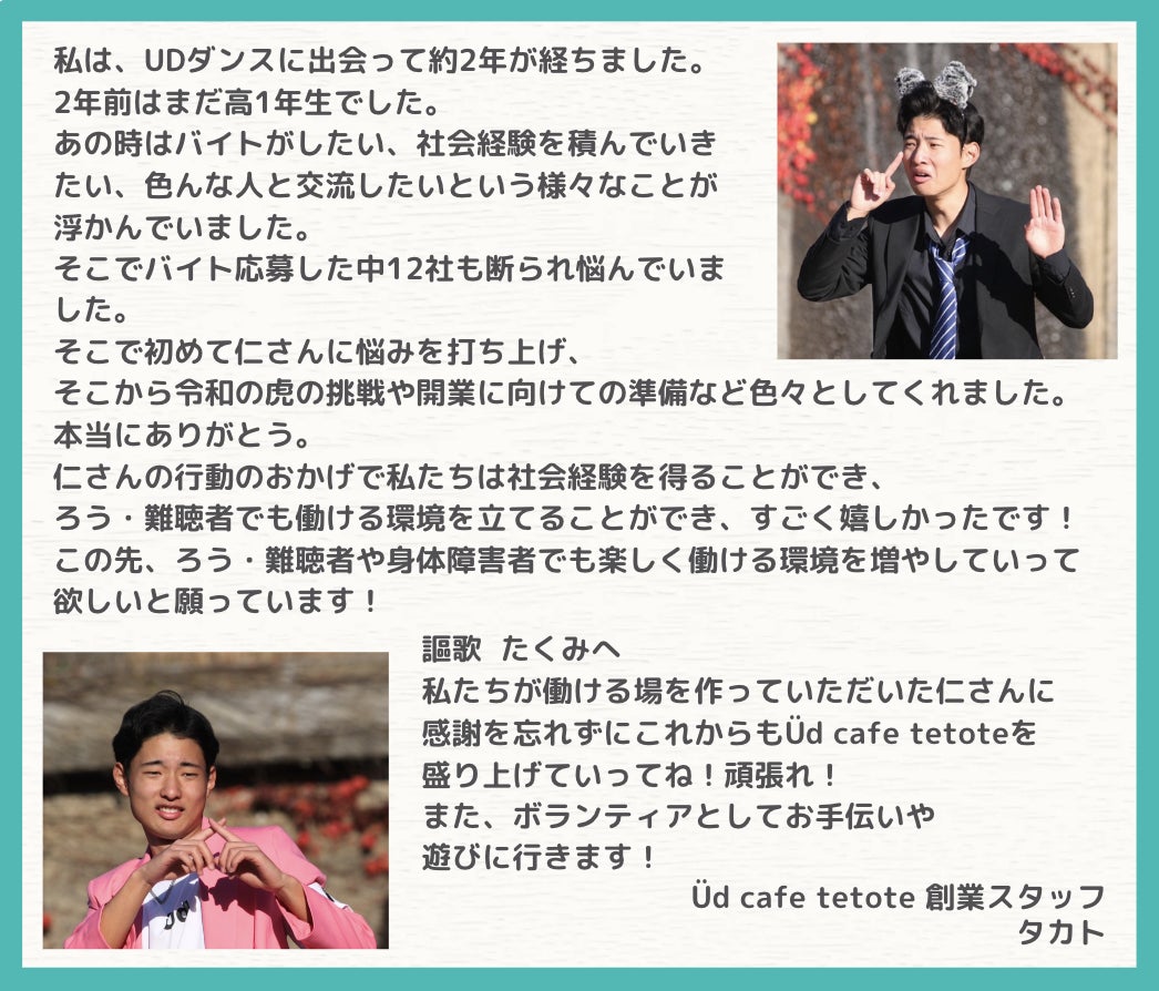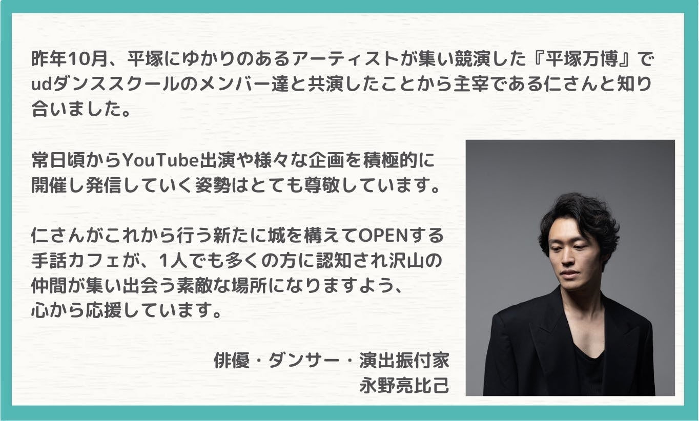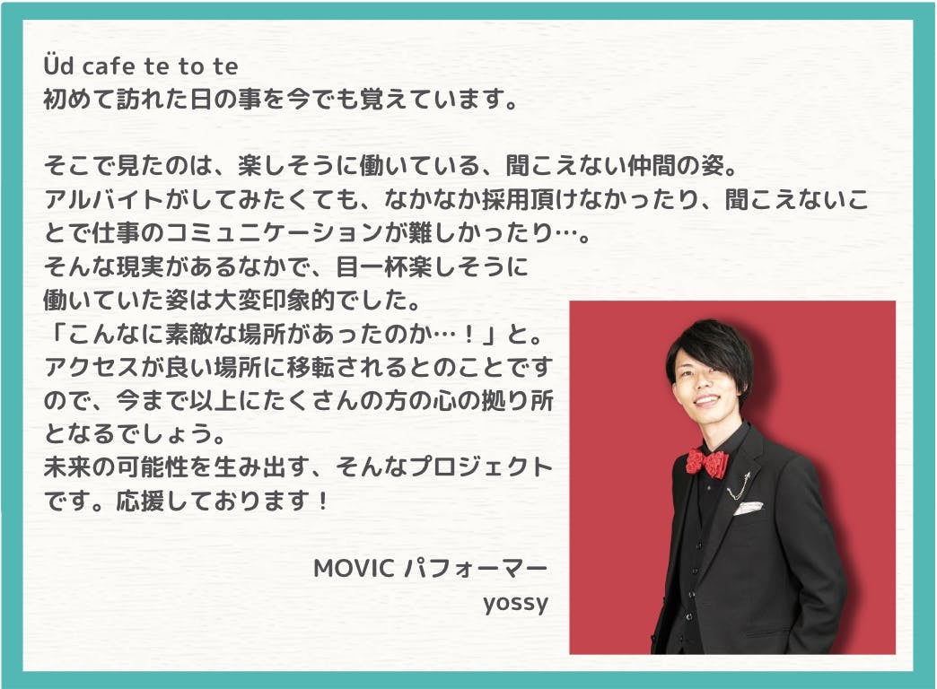アメリカのマーサズ・ヴィンヤード島をご存知でしょうか。誰もがごく普通に手話を使って話す島として知られています。このように、このÜd cafe te to teのプロジェクトは、障がいの有無問わずお互いがつながる環境をつくるために必要と感じ立ち上げました。平塚を中心に、耳の聞こえない若者の雇用を広げること、手話で踊るを文化にすること、そしてカフェを通して人々がつながる環境作りに、ご協力を何卒よろしくお願い申し上げます。