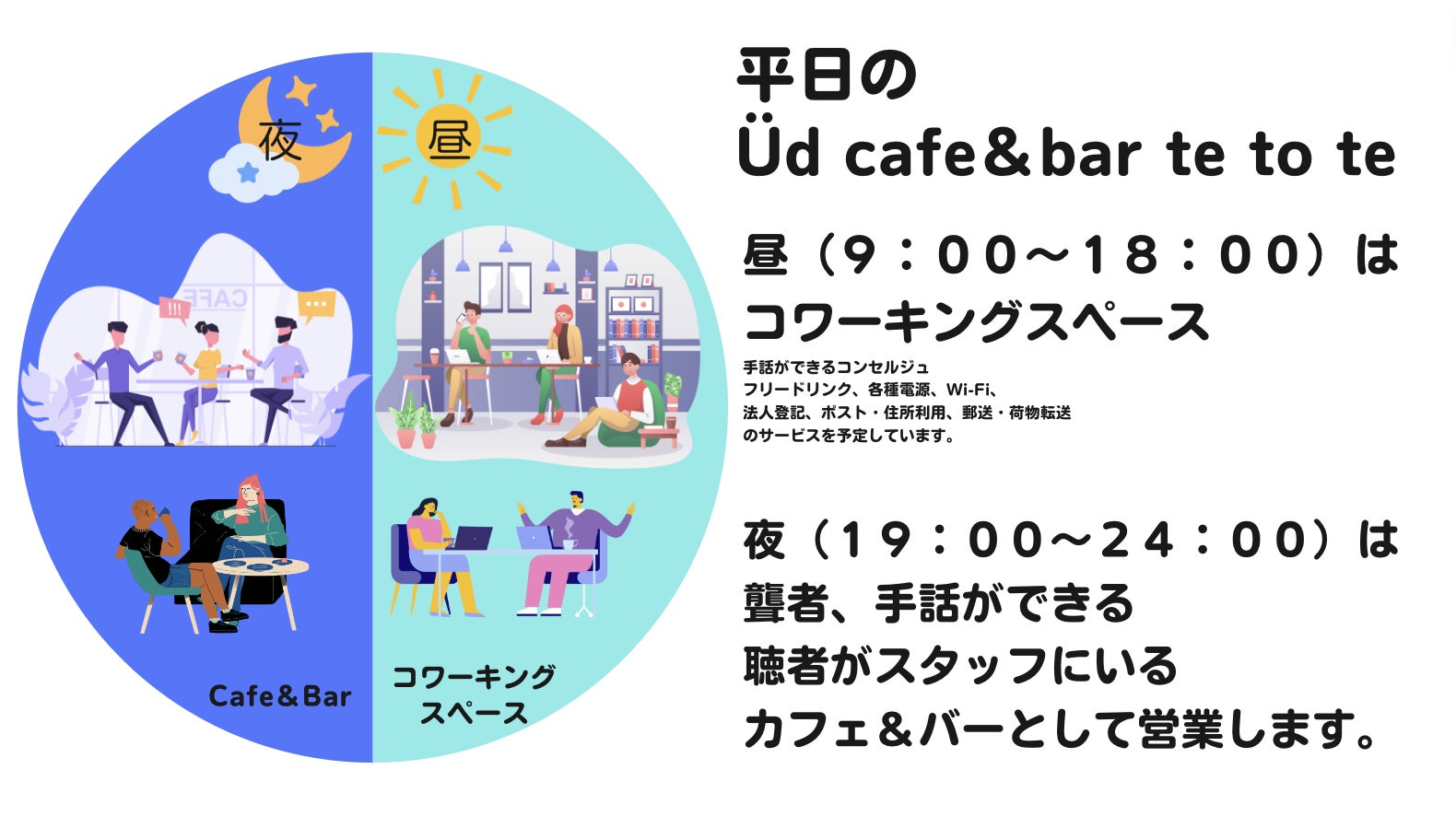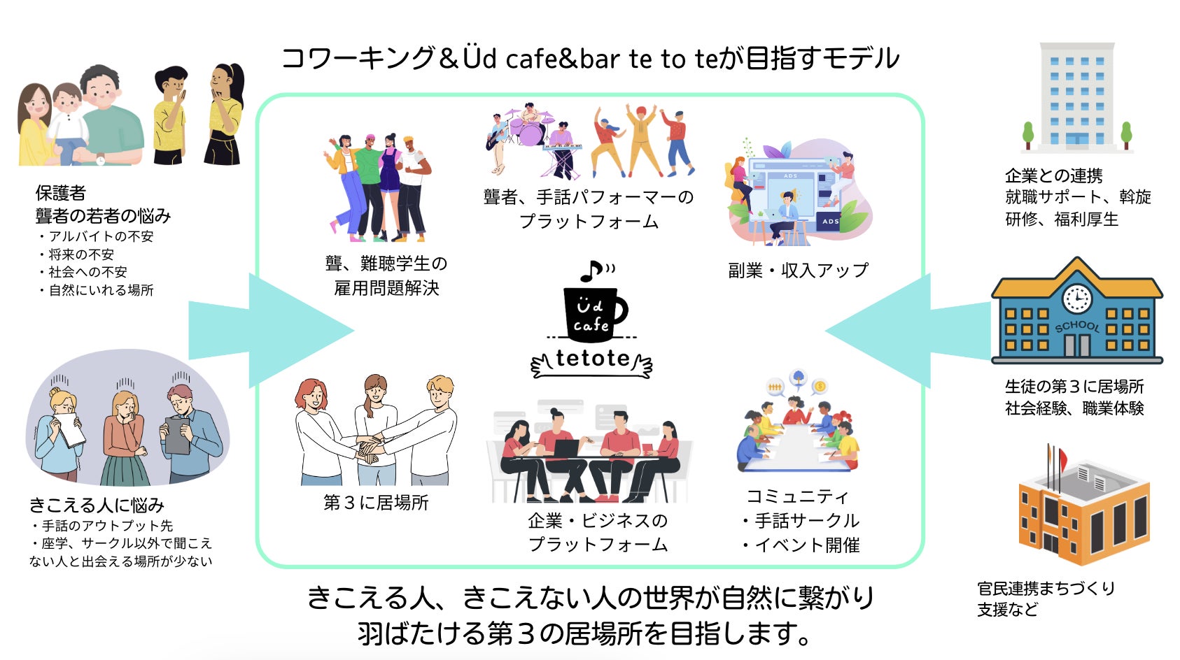 コンセプトは、「手話×エンターテイメント×カフェで聴覚障がい者の学生がアルバイトに困らずボーダーレスに人と人が繋がる場所へ」。