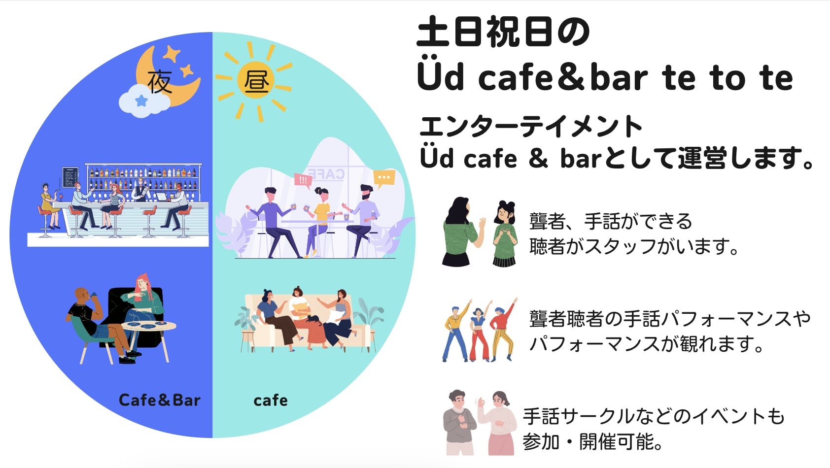 平日の夜と、土日はパフォーマンスも見れる手話カフェ&BARとして運営予定です!外部のイベントなども開催予定です!