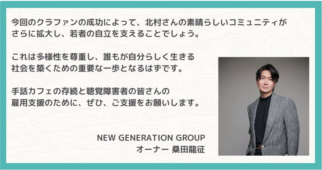 北村は「聞こえない学生でもアルバイトに困らない環境を作りたい」と考え、人気YouTubeチャンネル「令和の虎」の 『Tiger Funding』という企画で、手話カフェ開業の事業計画をプレゼンし、審査員の投資家より200万円の資金調達に成功。念願の店舗開店に至りました。