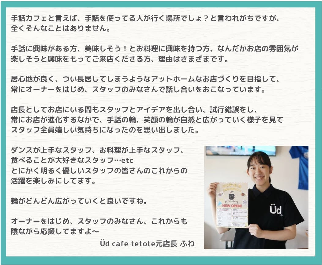はじめまして、神奈川県平塚市の「手話カフェ Üd cafe te to te」です。