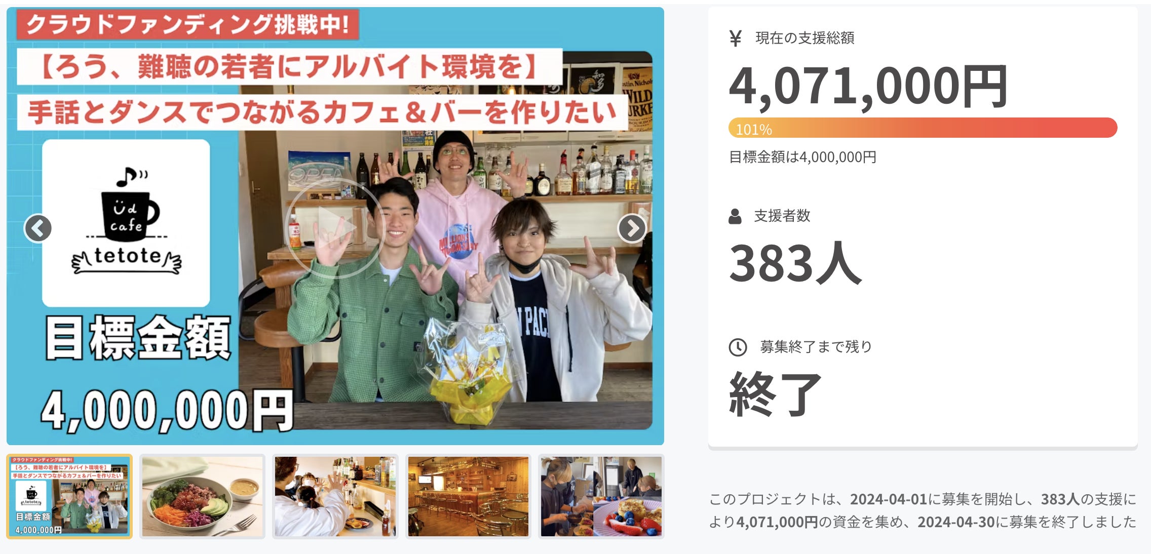 2024/05/02 12:034月1日〜30日まで行なったクラウドファンディングの結果、407万1000円のご支援をいただき、目標の400万を突破することができました!これで、お店をオープンすることができます!たくさんの応援本当にありがとうございました!!!※各リターンのお渡しなどについて詳しくは、順次ご連絡させてください※DIYメンバーの皆さんと振り返れば、クラファンスタート時(改装前)は、こんなウッディーな内装でしたが・・・ホワイトとティファニーブルーを基調とした店内に生まれ変わりました!↓5/4のオープンまでに、急ピッチで、新しい椅子やテーブルなどを配置していきます。手話が初めての方でも安心して楽しんでいただける手話カフェ&バーになりますので、ぜひたくさんの方に足を運んでいただければうれしいです。 ◆店舗概要手話カフェ「UD Cafe & Bar -te to te-」(ユーディーカフェ&バー テトテ)所在地:神奈川県平塚市紅谷町16-11大源第三ビル 2Fアクセス:JR平塚駅西口より徒歩2分UDカフェ&バーtetoteへのアクセスhttps://cafe.ud-dance.com/access/営業時間:平日 19:00-23:30(バー) ※5月4日より営業 土日祝 9:00-18:00(カフェ)※5月4日より営業 土日祝 19:00-23:30(バー) ※5月4日より営業<料金システム>カフェ:入場料なし(飲食代別途)バー :1200円/時 飲み放題(一部有料) もっと見る