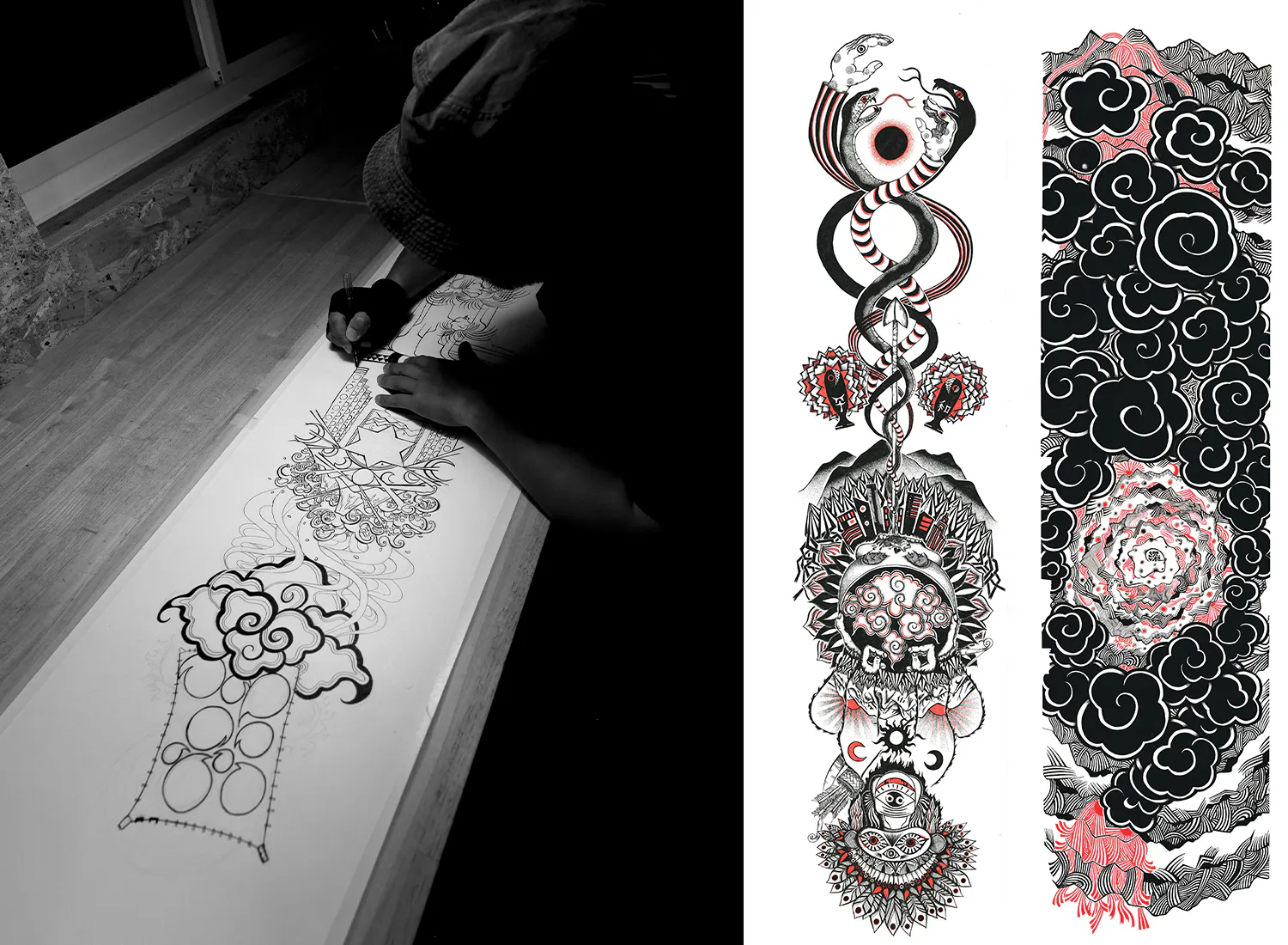 描く根底にはいつも“循環”というテーマが込められています。日々、自然の循環を感じ、描く絵にはそれらを表現していることに気づきました。天井画や宗教画、日本文化を自分なりに解釈したインスピレーションを表現しています。