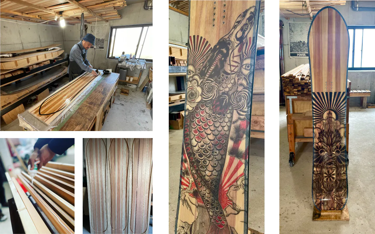 近年、自分で描いた絵を落とし込む表現方法として、スノーボードブランド、SIN.SNOWBOARD(シン スノボード)を立ち上げました。ボードに使用する木材は新潟で伐採された杉「越後杉」を使用し、グラフィックデザイン、製材、プレス、シェイプなど、マテリアルからボードが完成する全ての工程をひとりで行うボードビルダーとしても活動しています。