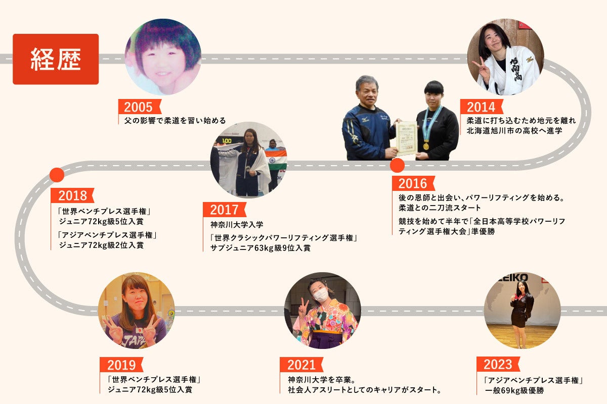 幼い頃から柔道や陸上をはじめ、様々なスポーツを経験してきました。そんな中で私がベンチプレスを始めたのは高校3年生の時。当時柔道部に所属していた私は、後の恩師をなる人物と偶然出会い、ベンチプレス(パワーリフティング)を始めました。