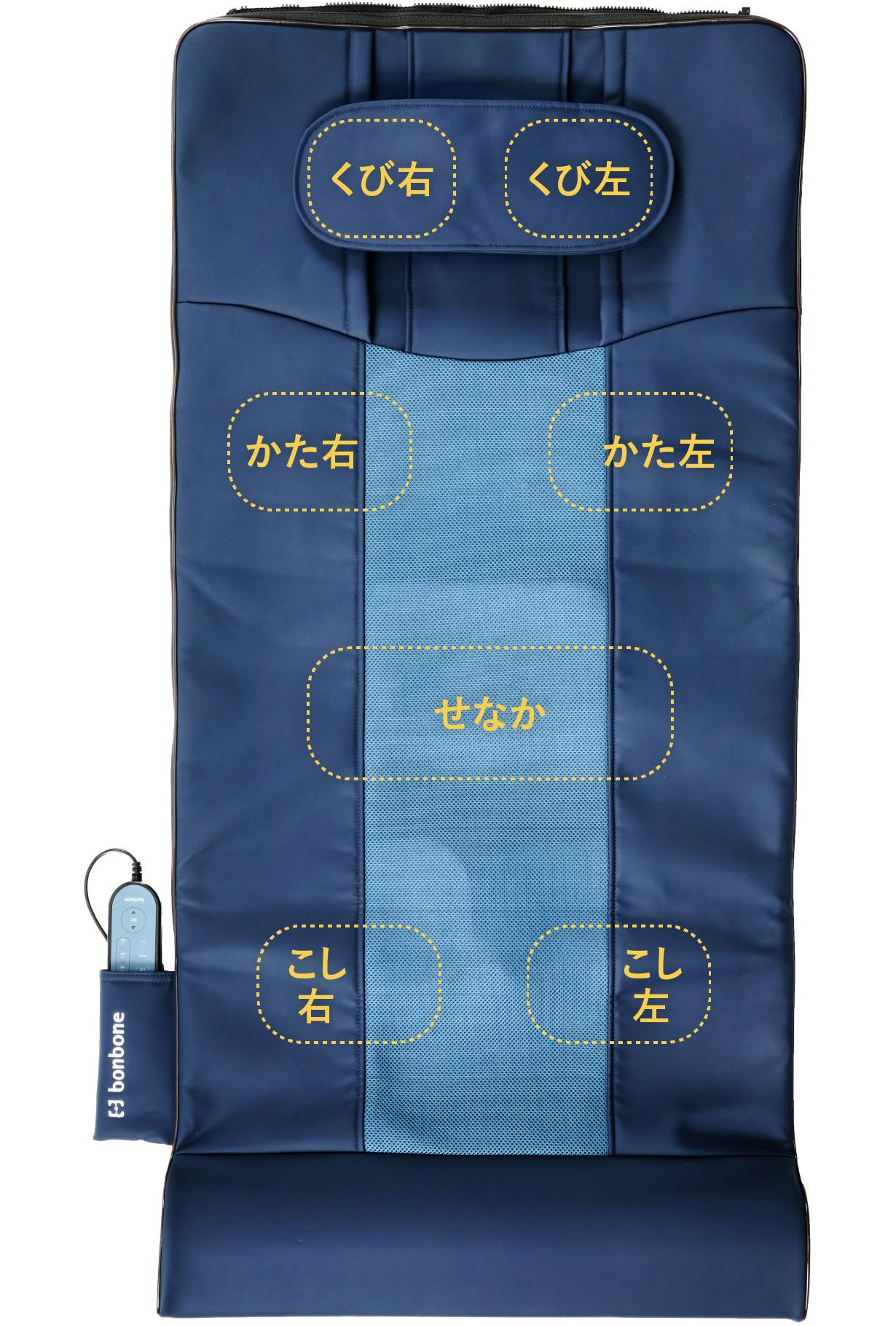 エアバッグは『首2、肩2、背中1、腰2』の7箇所に配置。自分では動かしにくい胸椎をエアーの力で簡単にストレッチできます。