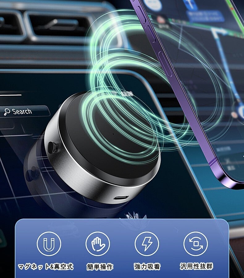 また、スタンドの一方がスマホに吸着し、もう一方が机、壁、車、パソコンなどに吸着する2WAY吸着式のデザインにより、様々なシーンでの利用が可能です。