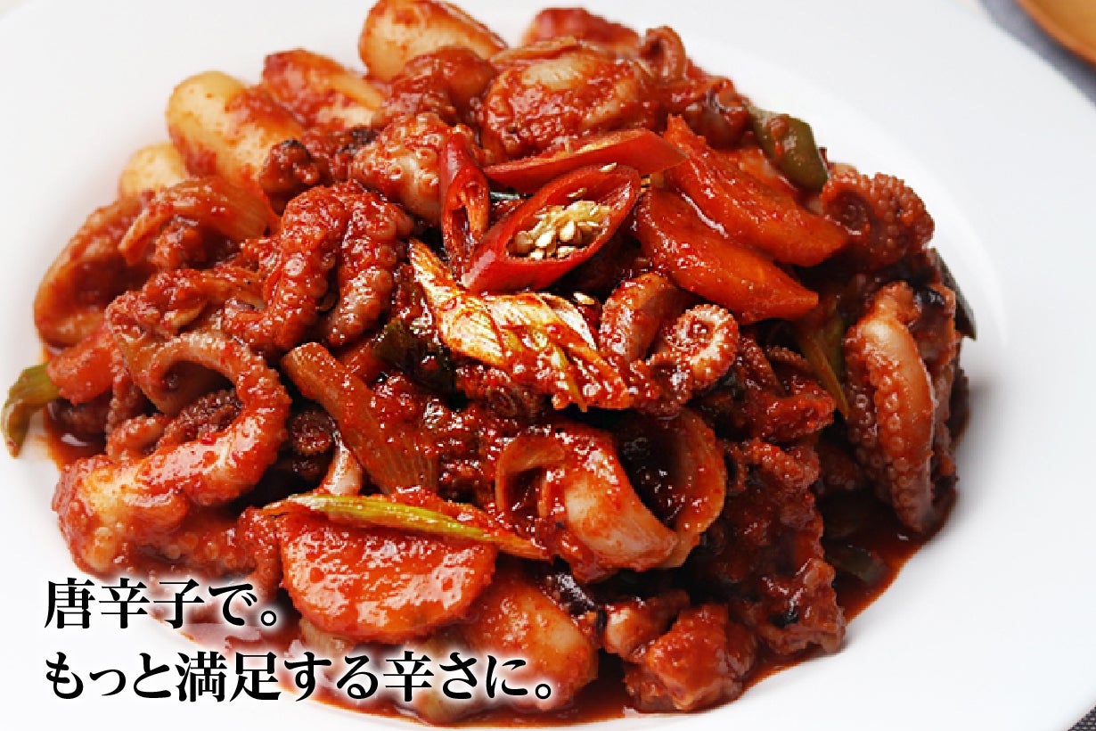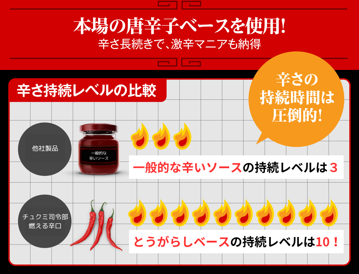 他社はコチュジャンベースが一般的な味付けの中、唐辛子ベースにすることで、より長時間の辛さが長続きします。にんにくも余すことなくたっぷり使用して風味も長続き。