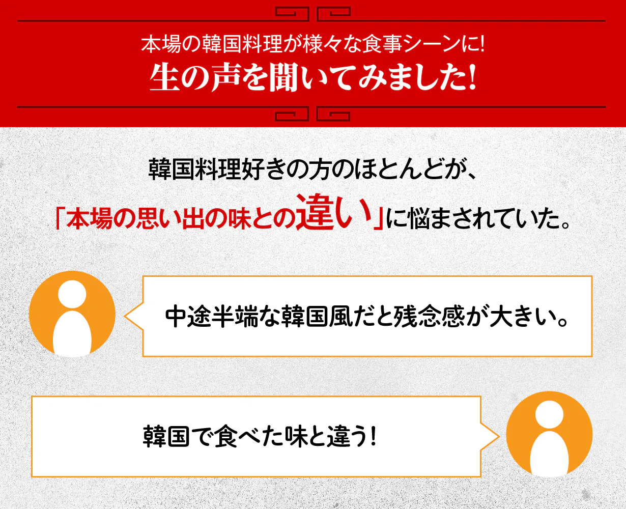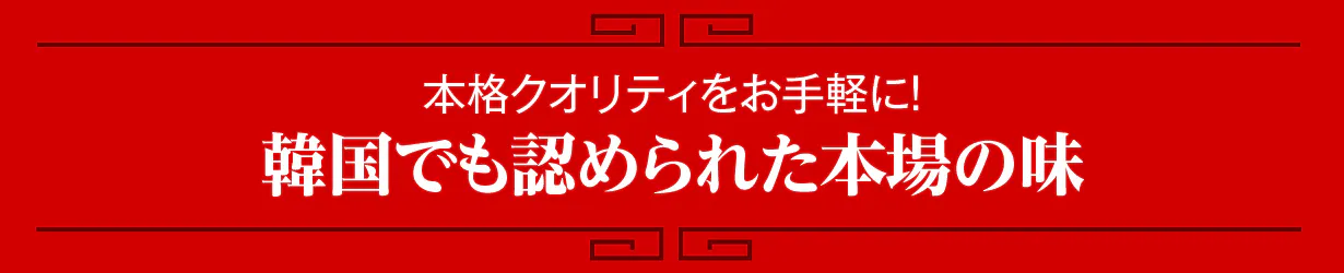 そこで私たちは、本場でも受け入れられた味をみなさんに届けたいと『こだわりの厳選素材』と『現地の味をそのまま再現する製法』を追求しました。真の韓国料理好きでも、本場の味と違うといったがっかり感を感じずお楽しみいただけます。