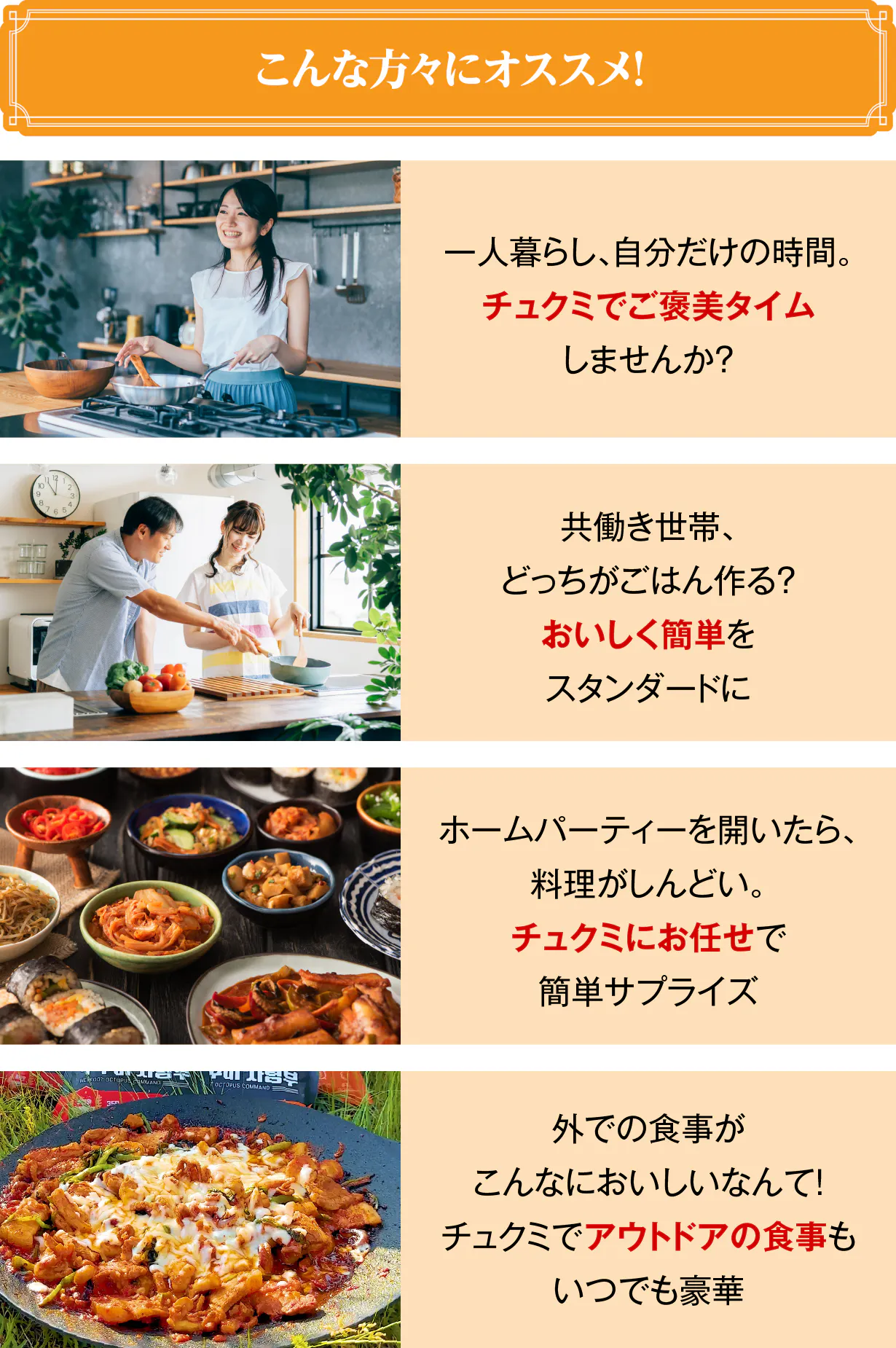 一人での密かな楽しみや家族での夕食で喜ばれるのはもちろん、友人を招いたホームパーティーや仲間とのアウトドアでも、難しい調理なしで驚きのサプライズ可能!