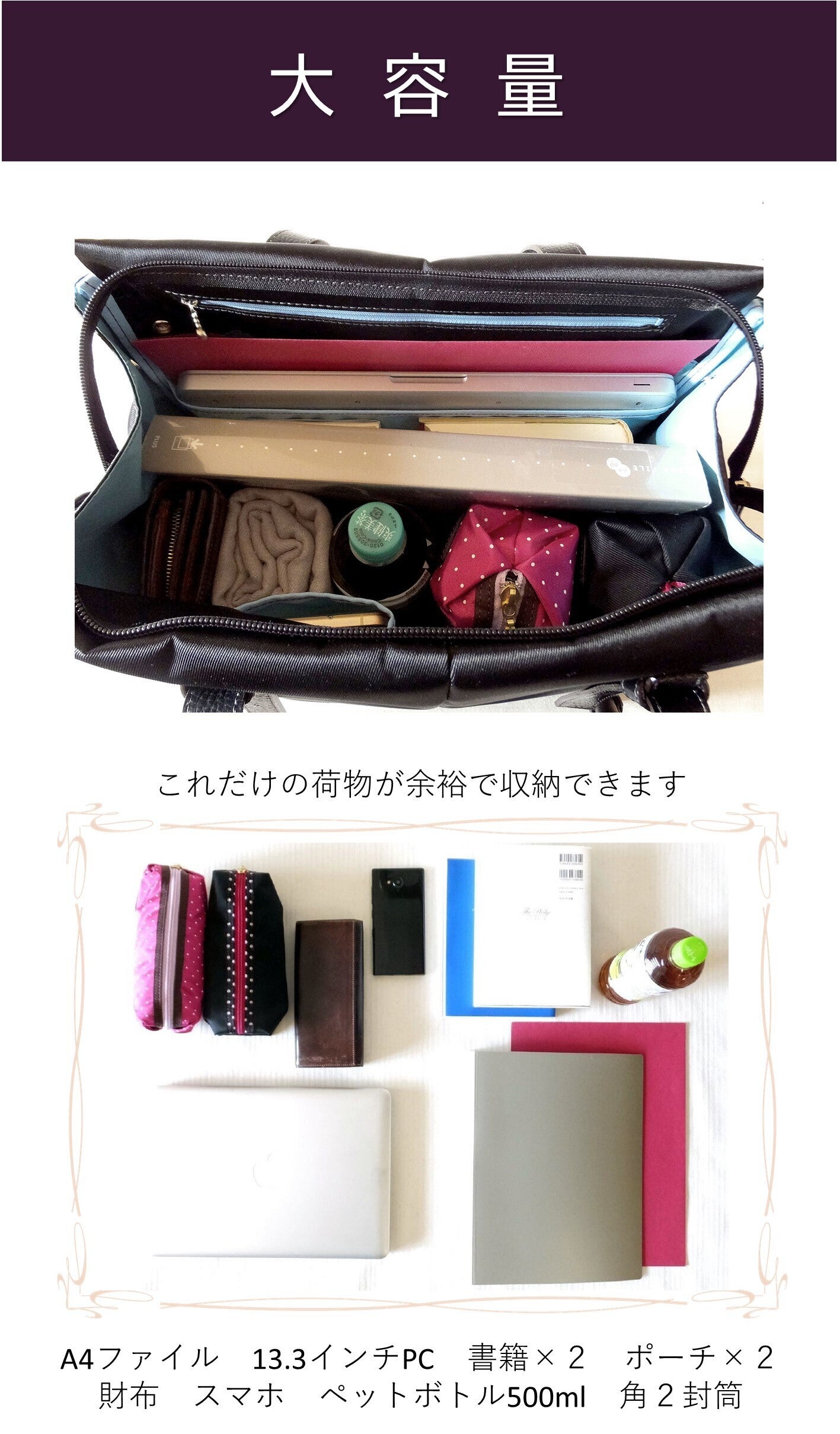 ・容量いっぱいに詰めて使用される場合は、メインファスナー(両開き)の引手を片側に2つとも寄せて閉めることをおすすめします(振動と圧力でファスナーが自然に開いてしまうのを防ぐため)