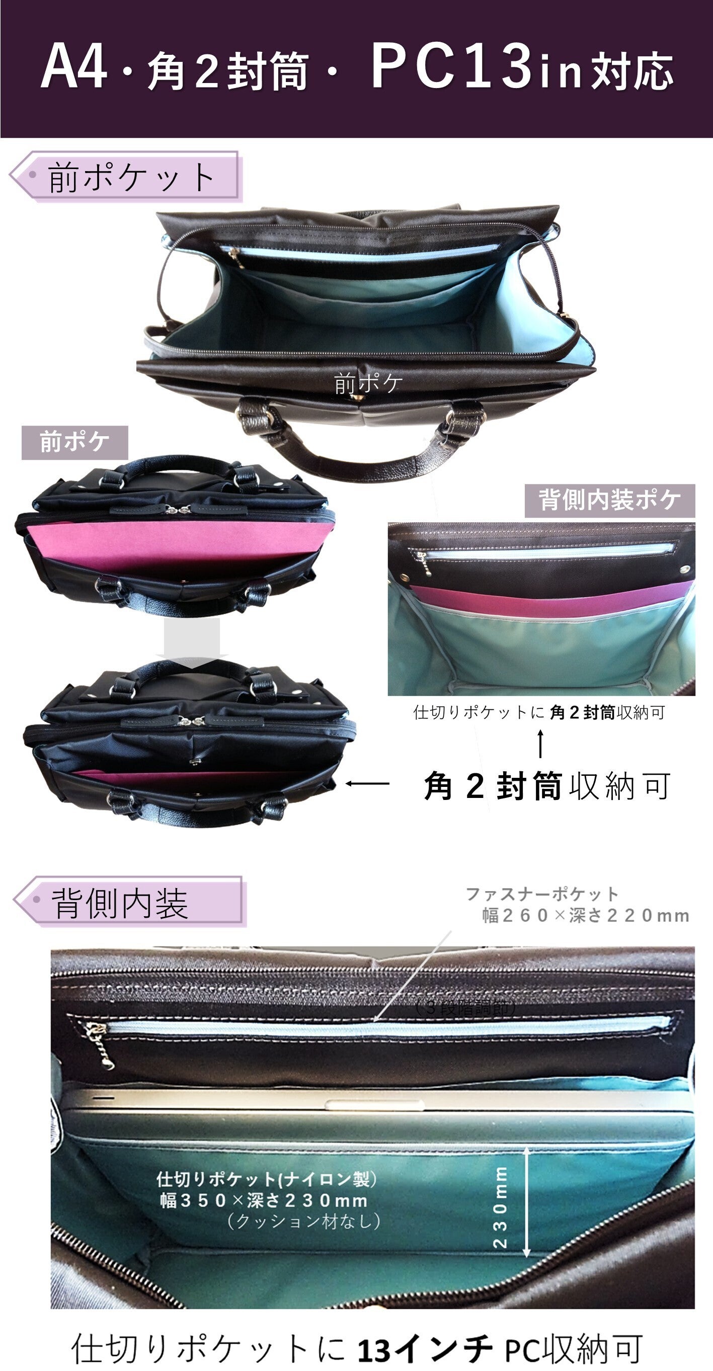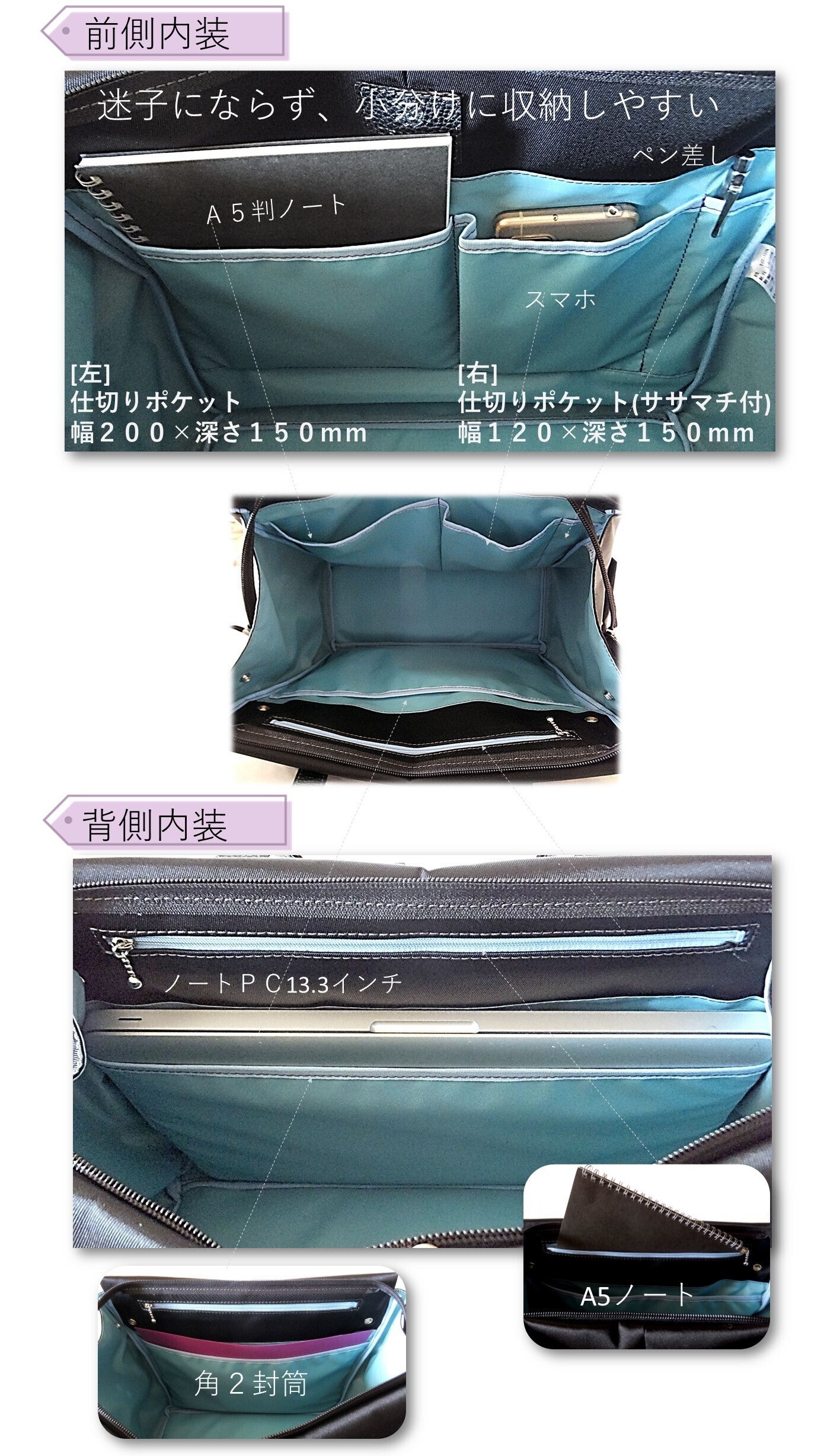 PC収納は《1》PC保護をさらにご希望 又は《2》裏地ポケットの消耗が気になる方は「セット割のPCケース(着脱ホック式)」のご利用をおすすめします