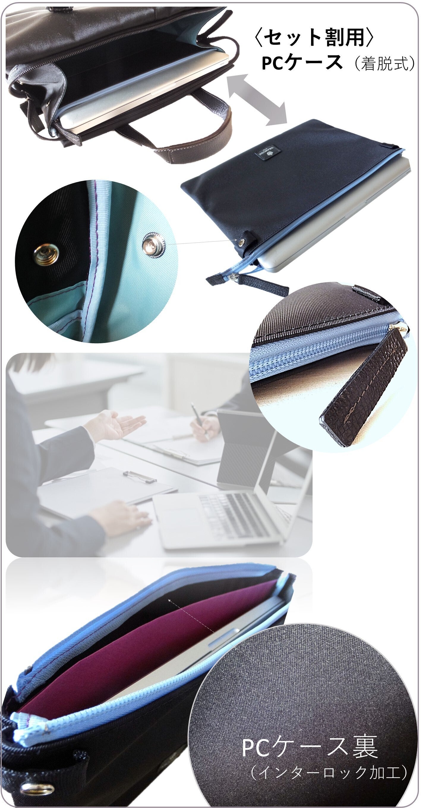 ・〈セット割のみ〉PCケースについて、着脱可能なホックの組み合わせは「1方向のみ」です(バッグ正面から見てPCケース左側に引手がある向きが正しい)