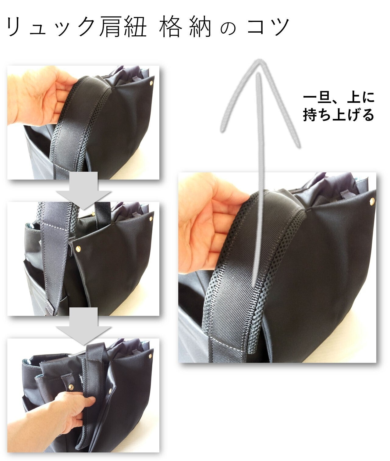 リュック肩紐の 格納 の<コツ>です。